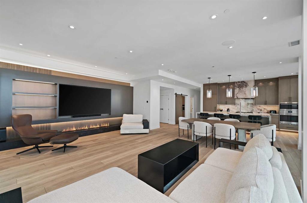 The culinary experience here is nothing short of exceptional. The chef-inspired kitchen showcases quartz waterfall countertops, upgraded fixtures including a premium kitchen faucet and pot filler, and a lineup of elite appliances: 36″ Sub-Zero fridge/freezer, Wolf gas cooktop, wall oven and built-in microwave. A rare butler’s pantry—appointed with custom cabinetry, a wine fridge, and an additional built-in Miele coffee machine—elevates both function and sophistication. Host with ease around the oversized island or unwind beside the mesmerizing 80″ water-vapour steam fireplace, with a 100″ living-room TV creating a true theatre-like atmosphere.