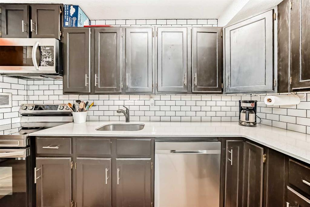 Welcome to Unit 4105 of Southampton Greens — a thoughtfully renovated 1-bedroom, 1-bath MAIN FLOOR condo unit in a quiet location within the complex. Updated in 2023 with quartz countertops, subway tile backsplash, new appliances, under-cabinet lighting, and plumbing fixtures. The unit features a bright and functional layout with vinyl plank flooring throughout for a clean and cohesive look. The tiled fireplace adds a cozy ambiance in the living room. Storage is never an issue with in-suite storage room plus two additional outdoor storage rooms on the 15 ft. x 6 ft. south-facing patio. Enjoy the expansive green space across the patio ideal for relaxing, gardening, or soaking up the sun. Condo fees cover heat, water, trash, common area maintenance, professional management, and reserve fund contributions. The complex offers excellent amenities including playground, party room, basketball court, tennis court, table tennis, fitness room, and visitor parking. This unit comes with one assigned, plug-in, parking stall. Centrally located with easy access to major routes and everyday essentials — minutes to Anderson LRT, Southcentre/Chinook Mall, numerous schools and parks. This unit offers convenience, comfort and enjoyment.