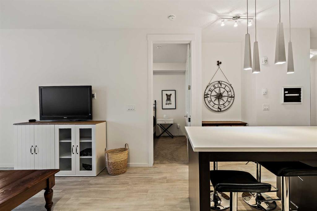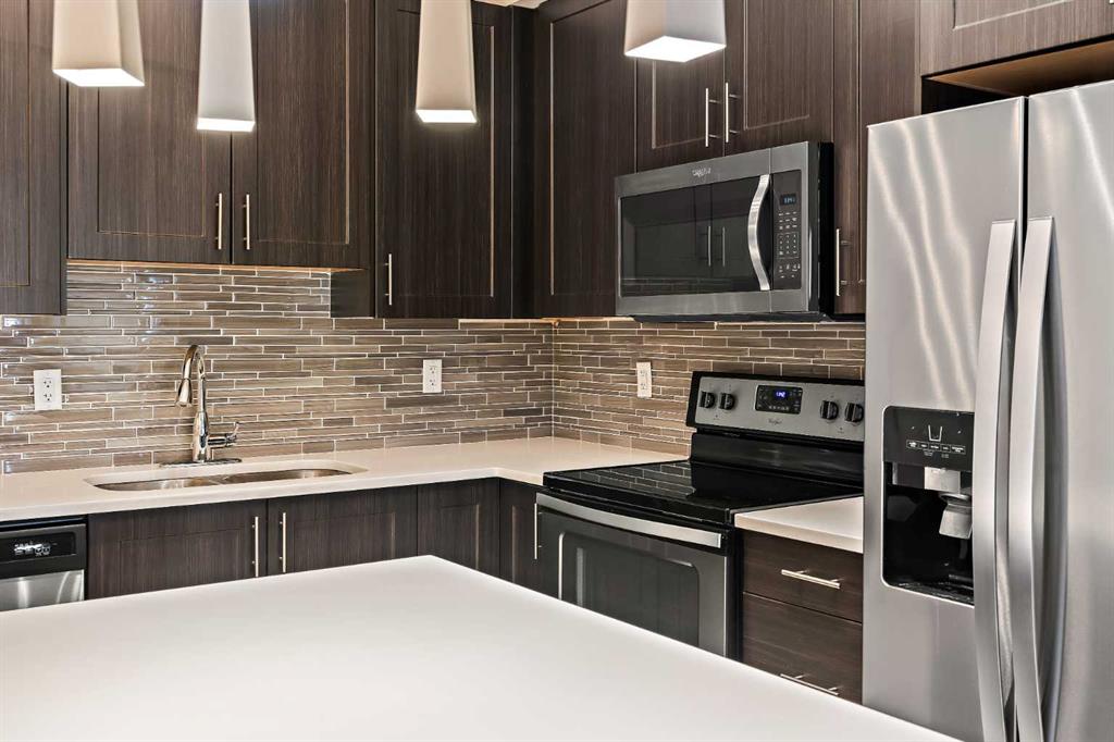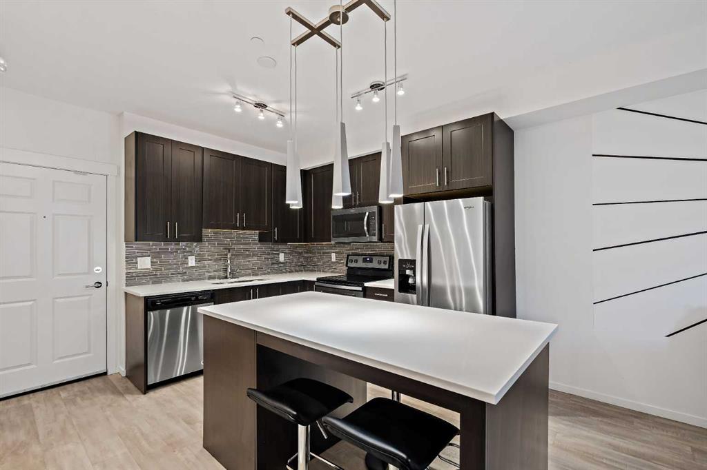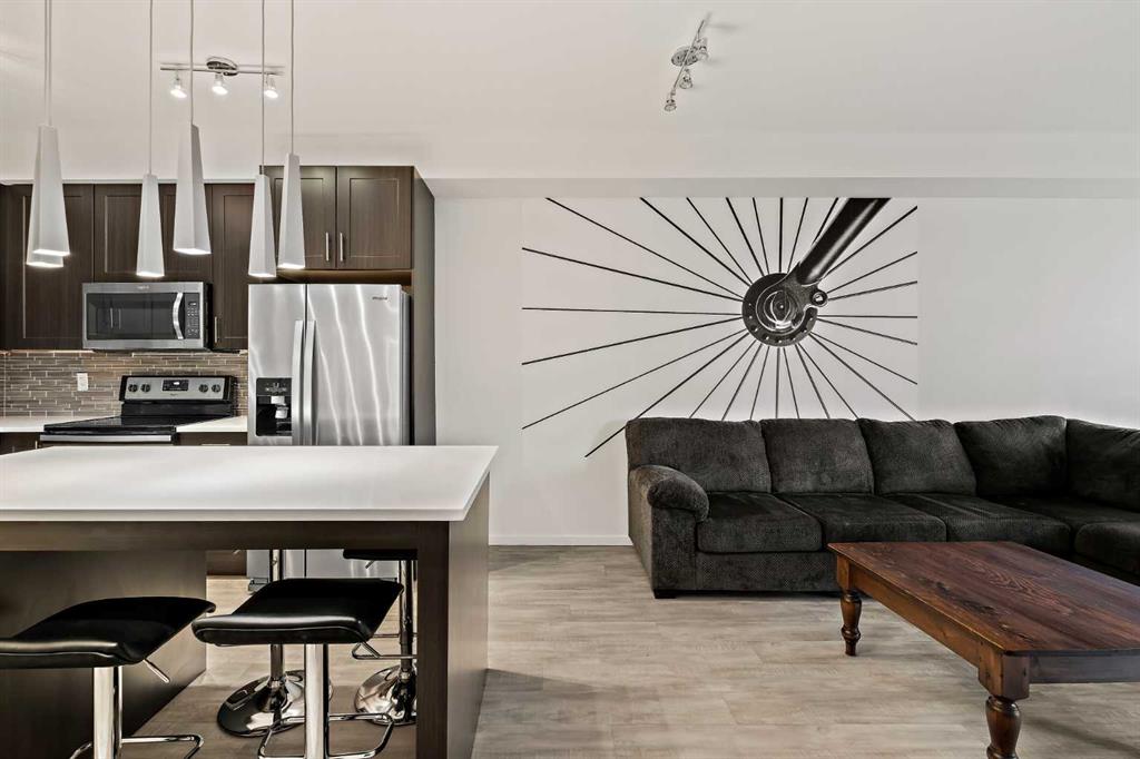 Ground-floor living meets thoughtful design in this bright and well-appointed 1 bedroom condo offering a seamless blend of comfort, style and everyday convenience. An open-concept layout paired with LVP flooring creates a durable, low-maintenance foundation that suits both relaxed daily living and easy entertaining. Extra windows flood the living area with natural light while direct access to the private west-facing patio extends the living space outdoors, making it ideal for morning coffees, evenings unwinding or pet owners who value quick outdoor access. A custom kitchen anchors the home with a striking glass backsplash, stainless steel appliances, upgraded Cartwright lighting and a generous center island with seating on both sides, encouraging connection whether hosting or cooking casually. A spacious bedroom overlooks the patio and is complemented by a massive walk-through closet that flows directly into the bathroom, enhancing both function and privacy. In-suite laundry adds everyday efficiency while titled underground parking and a dedicated storage locker provide secure, practical solutions. A pet-friendly complex with board approval supports flexible lifestyle needs and the surrounding community delivers exceptional walkability with pathways winding through nearby parks and ponds. Township Shopping Centre sits close by, offering convenient access to grocery stores, cafés, restaurants and everyday services, making errands and social plans easy without long drives. A sunny west-facing orientation, ground-level accessibility and abundant upgrades combine to create a polished, move-in-ready opportunity well suited to first-time buyers, downsizers or investors seeking low-maintenance living in a vibrant south Calgary community.