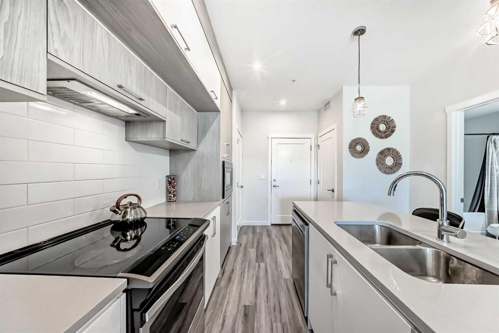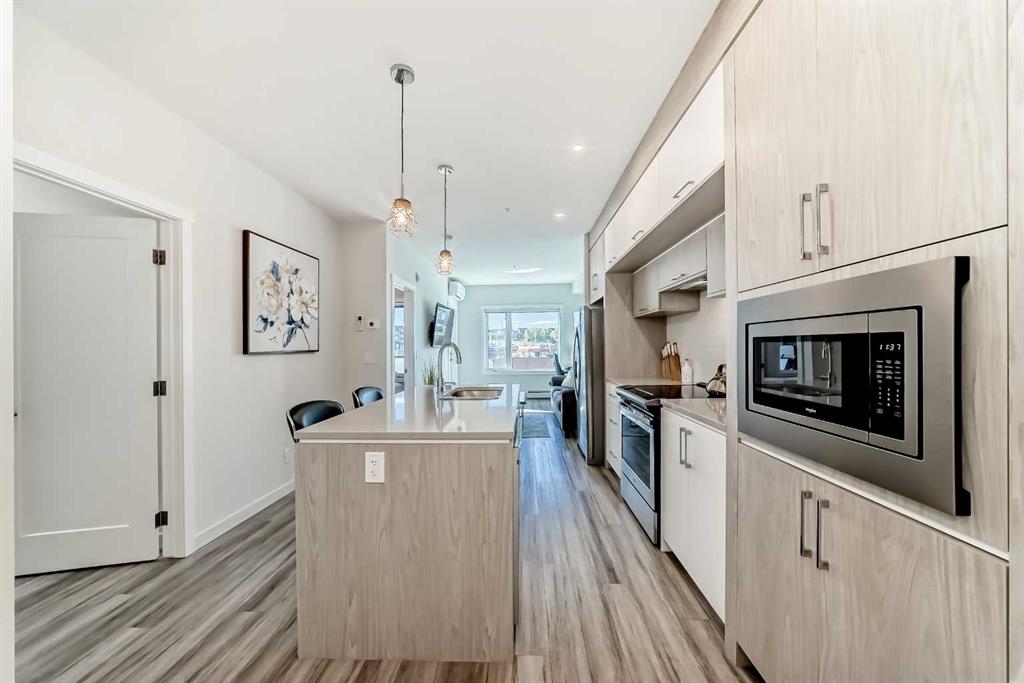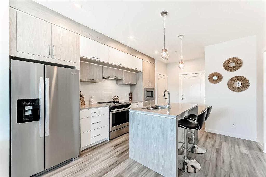 Welcome to your new home at 411, 138 Sage valley common NW. This exceptionally designed and well-maintained condo unit shows pride of ownership at all angles and is in one of Calgary’s finest and well-sought-after community of Sage Hill. This unit offers a sanctuary of light and space that will surely pick your interest when you step in through the door. It boasts of 520 square feet of developed space that includes an open concept layout with a seamless flow from the beautiful kitchen to a living room that overlooks a good size balcony. This unit comes with a large primary bedroom with two windows allowing for lots of natural lighting, a walk-in-closet, an in-suite laundry, a large 4-piece bath, and with Luxury vinyl planks flooring. The good size kitchen is equipped with stainless steel appliances, upgraded high end cabinetry, and a central island with quartz countertops.