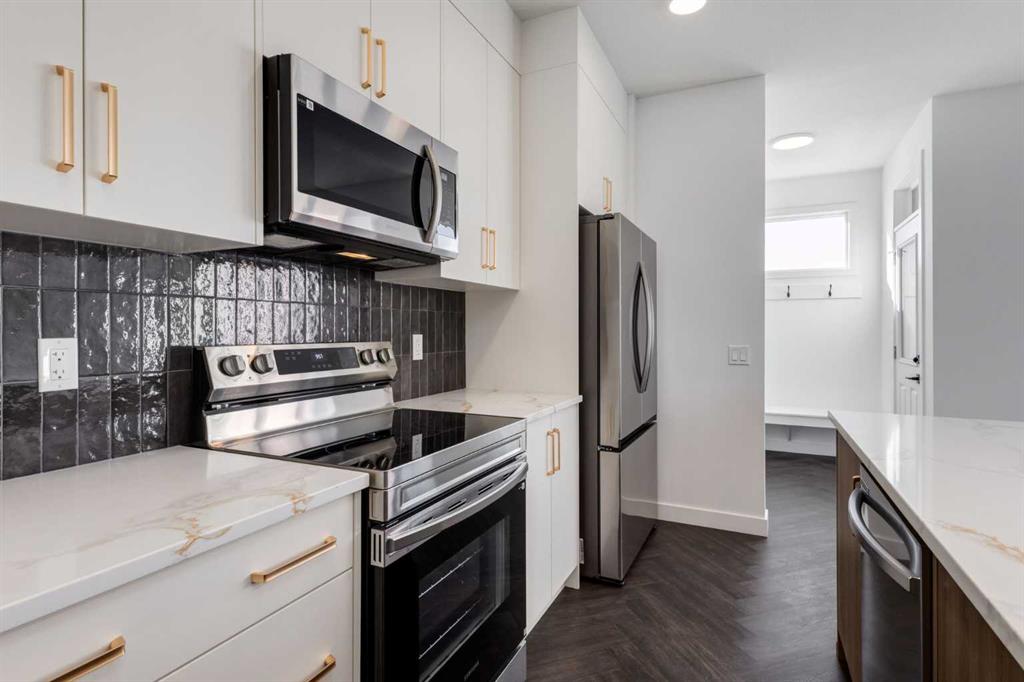 **Eligible First Time Buyers Save 5% with new government GST rebate ** Open House at show home – 120 Clydesdale Ave, Cochrane – March 28th 1-4pm, March 29th 12-3pm and March 31st 1-4pm ** Welcome to this beautifully crafted unit of a four-plex – Talo model by Rohit Homes, situated in the vibrant and rapidly growing community of Heartland in Cochrane. This home is an excellent fit for families, first-time buyers, or anyone looking to right-size without compromising on style or versatility. Offering 3 bedrooms, 2.5 bathrooms, and 1,520 sq. ft. of well-designed living space, this brand-new home features a bright, open-concept main floor with 9′ ceilings and a seamless connection between the kitchen, dining, and living areas—ideal for both daily living and entertaining. The contemporary kitchen serves as the focal point, complete with quartz countertops, a central island, and modern cabinetry that blend practicality with sophisticated design. At the rear, a parking pad provides convenient parking while preserving the home’s inviting curb appeal.