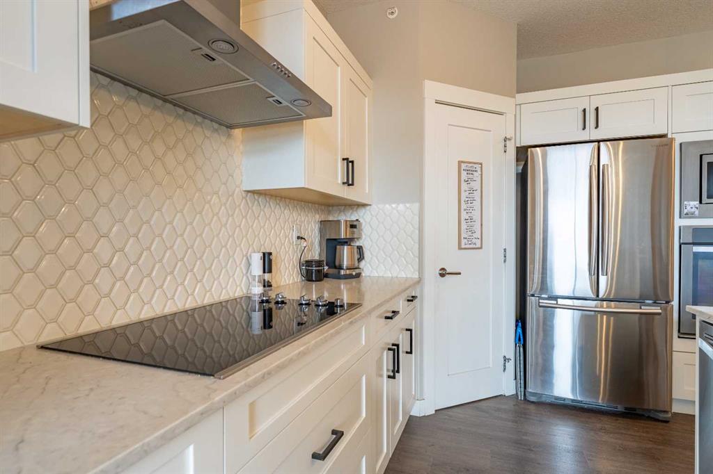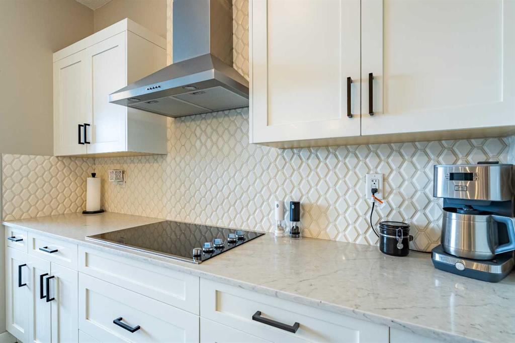 The SLEEK GOURMET KITCHEN is a chef’s dream, showcasing MODERN WHITE cabinetry with soft-close drawers, QUARTZ COUNTERTOPS, a corner PANTRY with shelving, STAINLESS STEEL APPLIANCES (including electric cooktop and built-in wall oven/microwave, fluted chimney hoodfan and dishwasher), and stylish tile backsplash. The breakfast bar is perfect for casual dining or meals on the go!