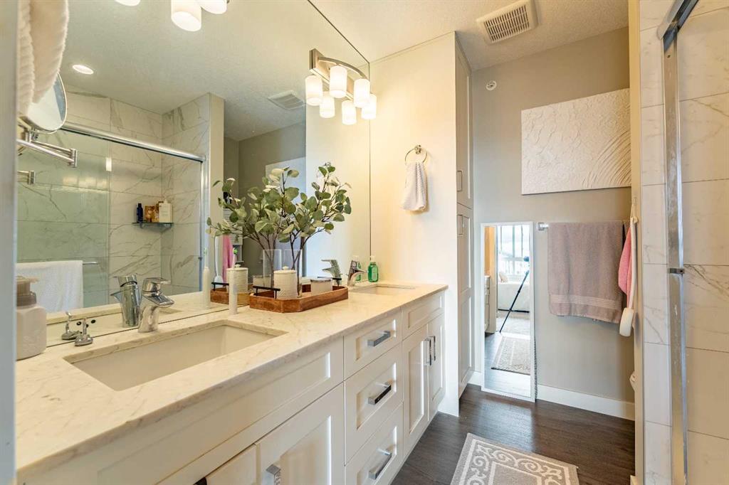 The SPACIOUS PRIMARY BEDROOM is your CALM RETREAT featuring UPGRADED carpets installed dec 2024, a WALK-IN CLOSET, and a PRIVATE 4-PIECE EN-SUITE with DUAL VANITIES and a LARGE STAND UP SHOWER for ultimate relaxation. The SECOND LARGE BEDROOM offers incredible FLEXIBILITY—perfect for guests, a home office, or library—with beautiful unobstructed south views.