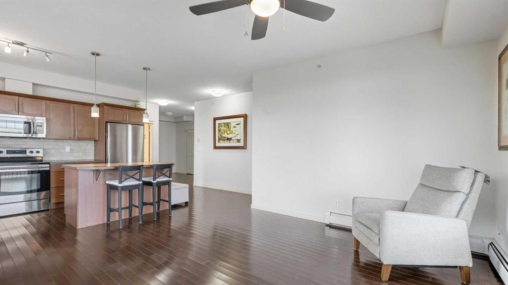 Welcome to one of the premier residences in Cranston a rare top floor corner unit that truly stands out from the rest. This expansive 2-bedroom, 2-bath + dedicated office home is one of the largest units in the building, offering an exceptional layout, elevated privacy, and natural light pouring in from multiple directions. Positioned on the top floor and corner of the building, this home benefits from additional side windows, flooding the space with sunlight and creating a bright, airy feel throughout the day. The elevated location also delivers mountain views from the back, while facing a green space—a perfect balance of scenery and serenity. Adding to the appeal is a titled, heated underground parking stall, providing year-round convenience, security, and comfort—no scraping windows or braving the cold in winter. The thoughtfully designed floor plan offers generous living and nook, designed for relaxed living and easy functionality. The dedicated office space is a standout feature perfect for working from home, a creative studio, or a quiet retreat. Two spacious bedrooms and two full bathrooms provide comfort, privacy, and flexibility for a variety of lifestyles.