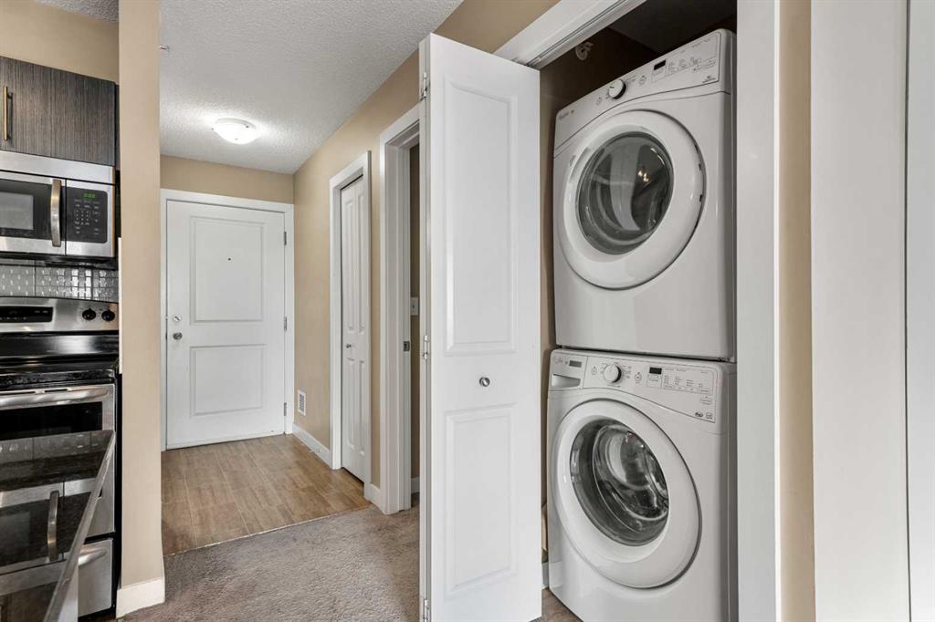 Are you looking for a smart investment or a place to call your own at an attractive price point with low condo fees? This could be the one. This fantastic condo delivers comfort, practicality, and real value with low condo fee’s. Situated on the TOP FLOOR , this MOVE-IN-READY unit offers a fabulous peaceful PARK/POND VIEW and a setting you’ll appreciate every day. This well-kept and spacious 2-bedroom, 1-bathroom condo is located in the family-friendly, amenity-filled community of Saddle Ridge. The location is hard to beat, with quick access to the Saddletown C-Train Station, the Genesis Centre, nearby restaurants, and an excellent proximity to a network of walking and biking paths. This bright top-floor unit spans nearly 700 sq. ft. and features an open-concept layout designed to make the most of the space. From the main living area, step onto the sun-filled south-facing balcony and take in relaxing views of the park and scenic pond — a great place to recharge or host guests. The kitchen flows seamlessly into the main living space and includes stone countertops, rich dark cabinetry, & generous counter space. The additional large counter makes it the perfect spot for everyday use, casual meals or hosting family and friends.