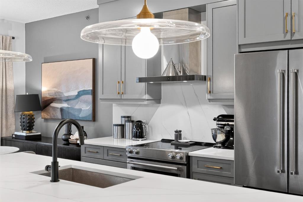 The kitchen was designed to impress, featuring a dramatic waterfall quartz island, stainless steel appliances, upgraded cabinetry, and elevated designer finishes throughout. Whether entertaining or enjoying a quiet evening at home, the space feels modern, intentional, and effortlessly stylish.