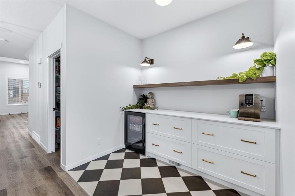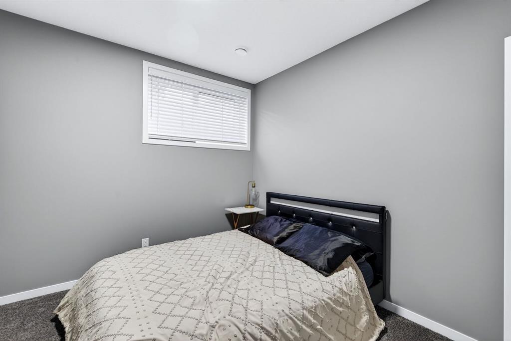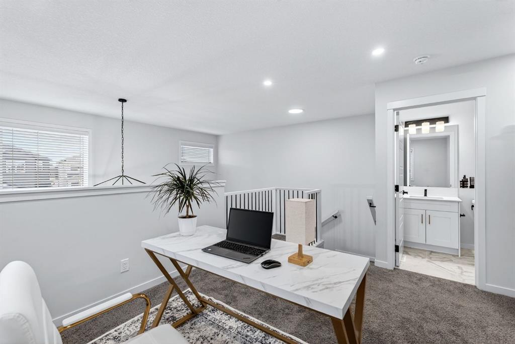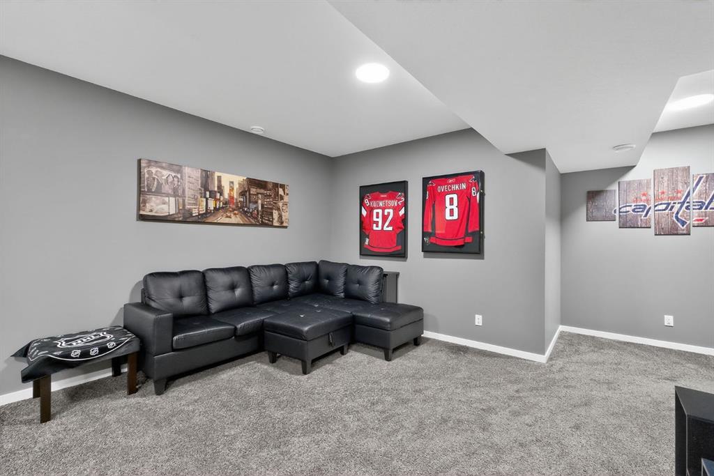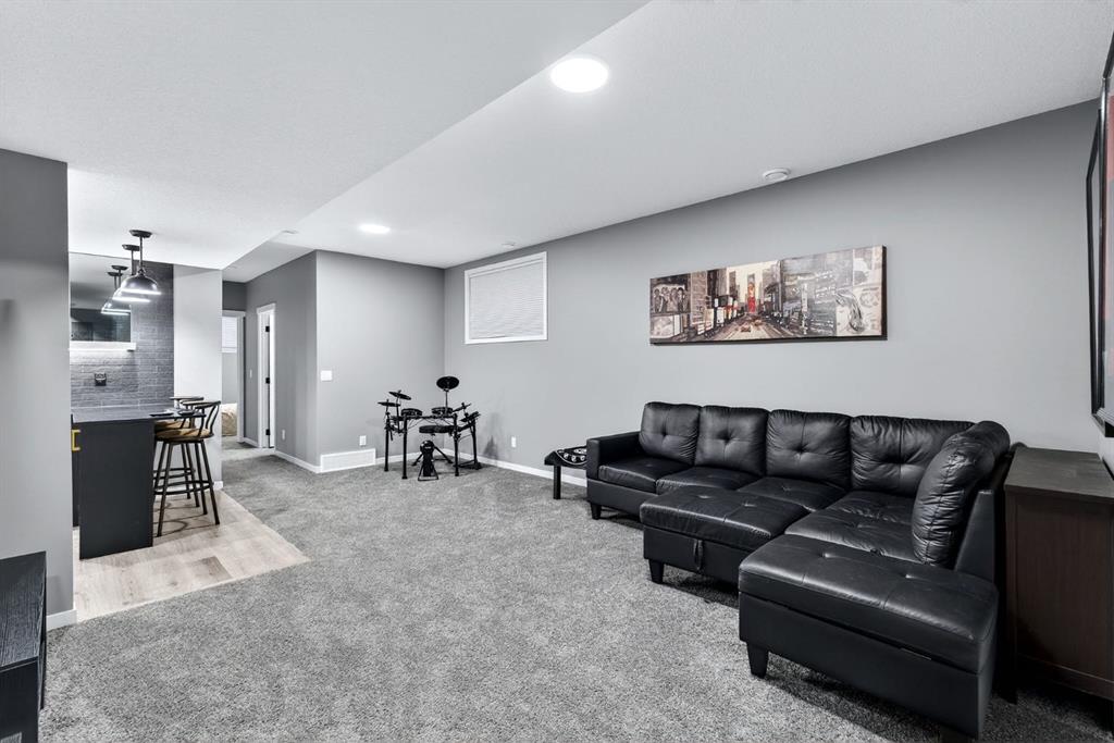 At the heart of the home is the custom kitchen and coffee nook, truly the nucleus of the space. Featuring an oversized island with seating, sleek white cabinetry with soft-close drawers, quartz countertops, stainless steel appliances, and statement lighting, this kitchen is as beautiful as it is practical. Built-in ceiling speakers elevate the experience whether you’re cooking, hosting, or enjoying a quiet morning coffee. The adjacent dining area offers a clean, modern setting for everyday meals or special gatherings. The upper level continues to impress with a bright open loft, ideal for a home office, reading nook, or flex space. Two generously sized bedrooms complete this level, including a serene primary retreat designed for rest and relaxation. The spa-inspired ensuite, upgraded with a premium spa package, showcases a deep soaker tub, glass-enclosed shower, elegant tilework, modern fixtures, and a sleek vanity—turning daily routines into a luxury experience. A walk-in closet with custom shelving completes the primary suite. The fully developed basement is where this home truly sets itself apart. Designed for entertaining and everyday enjoyment, this level features a spacious recreation area, a third bedroom, and an unforgettable custom $20,000 bar that steals the show. Finished with black tile, tinted mirrors, black quartz countertops, statement lighting, and matching custom finishes in the basement bathroom, this space delivers a true wow factor. Built-in ceiling speakers complete the experience, making it perfect for hosting friends, movie nights, or relaxing evenings at home. Location is the finishing touch. Ideally positioned on the edge of the city, this home offers quick access to both McLeod Trail and Deerfoot Trail, making commuting effortless in any direction including an easy drive west toward the mountains. A new commercial plaza with Tim Hortons sits just one street to the east, while greenways, walking paths, and a playground are located one street to the west, offering the perfect balance of convenience and lifestyle. This home is a rare blend of modern design, high-end upgrades, and thoughtful functionality perfect for buyers looking for a property that truly stands out.