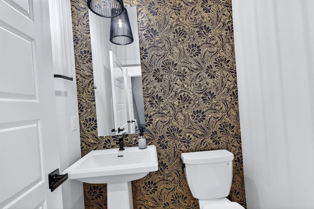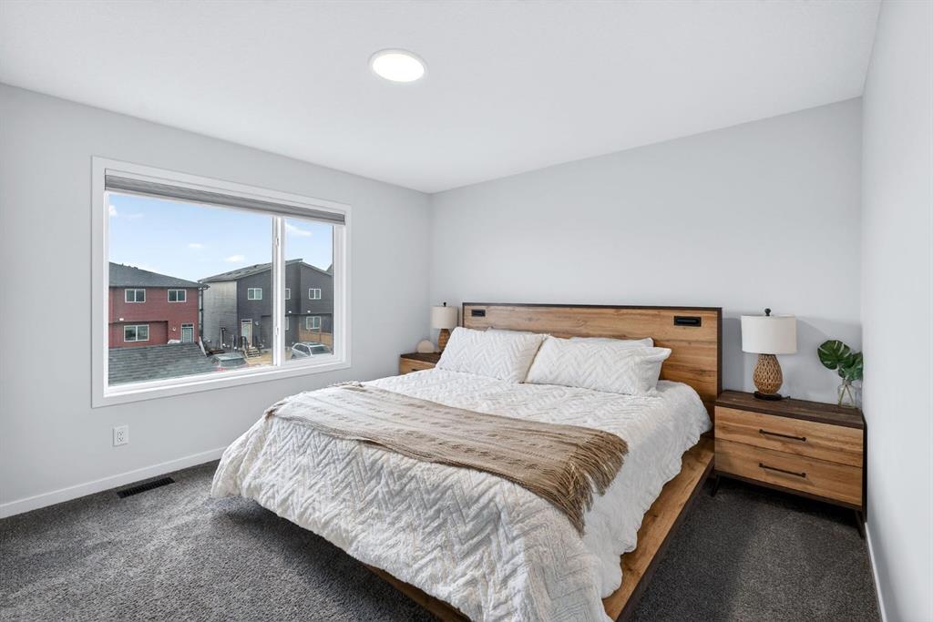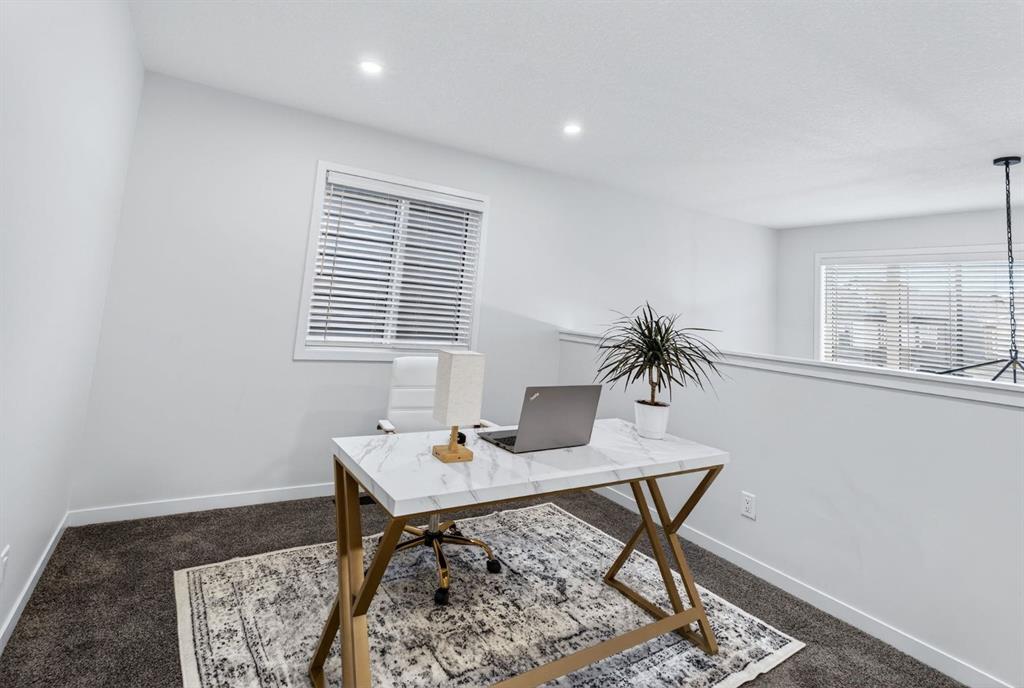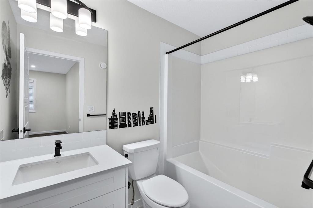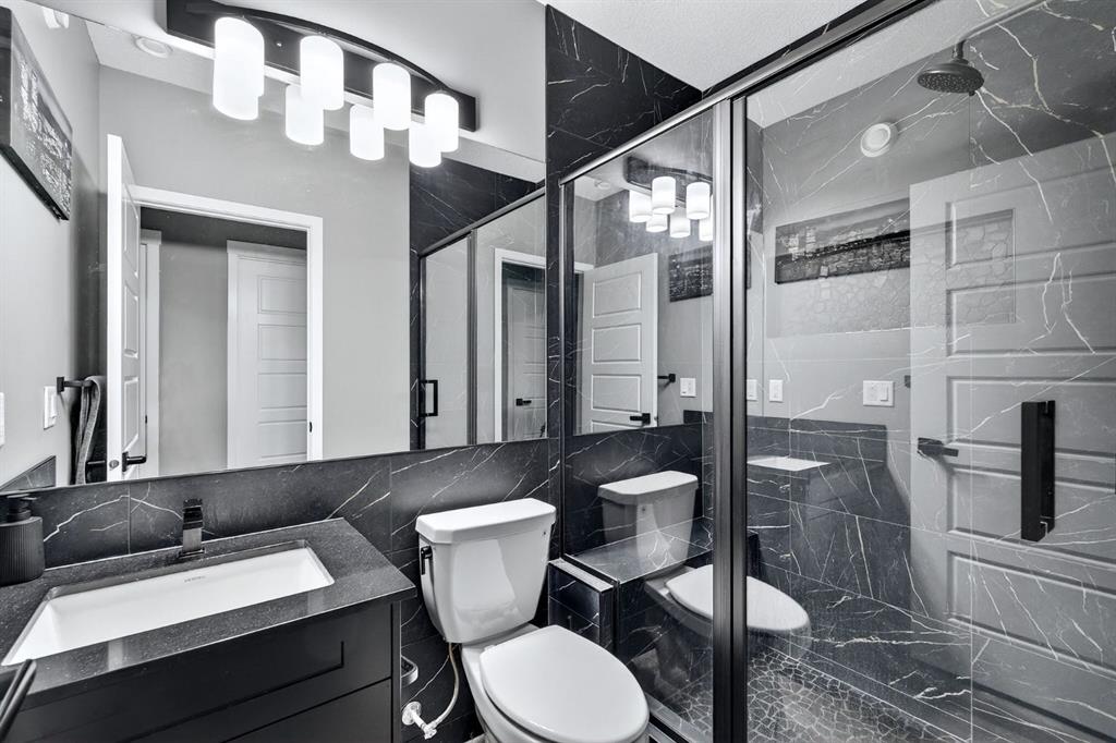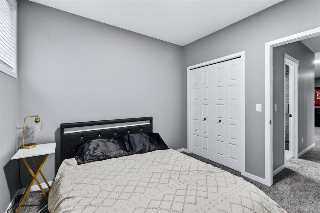 At the heart of the home is the custom kitchen and coffee nook, truly the nucleus of the space. Featuring an oversized island with seating, sleek white cabinetry with soft-close drawers, quartz countertops, stainless steel appliances, and statement lighting, this kitchen is as beautiful as it is practical. Built-in ceiling speakers elevate the experience whether you’re cooking, hosting, or enjoying a quiet morning coffee. The adjacent dining area offers a clean, modern setting for everyday meals or special gatherings. The upper level continues to impress with a bright open loft, ideal for a home office, reading nook, or flex space. Two generously sized bedrooms complete this level, including a serene primary retreat designed for rest and relaxation. The spa-inspired ensuite, upgraded with a premium spa package, showcases a deep soaker tub, glass-enclosed shower, elegant tilework, modern fixtures, and a sleek vanity—turning daily routines into a luxury experience. A walk-in closet with custom shelving completes the primary suite. The fully developed basement is where this home truly sets itself apart. Designed for entertaining and everyday enjoyment, this level features a spacious recreation area, a third bedroom, and an unforgettable custom $20,000 bar that steals the show. Finished with black tile, tinted mirrors, black quartz countertops, statement lighting, and matching custom finishes in the basement bathroom, this space delivers a true wow factor. Built-in ceiling speakers complete the experience, making it perfect for hosting friends, movie nights, or relaxing evenings at home. Location is the finishing touch. Ideally positioned on the edge of the city, this home offers quick access to both McLeod Trail and Deerfoot Trail, making commuting effortless in any direction including an easy drive west toward the mountains. A new commercial plaza with Tim Hortons sits just one street to the east, while greenways, walking paths, and a playground are located one street to the west, offering the perfect balance of convenience and lifestyle. This home is a rare blend of modern design, high-end upgrades, and thoughtful functionality perfect for buyers looking for a property that truly stands out.
