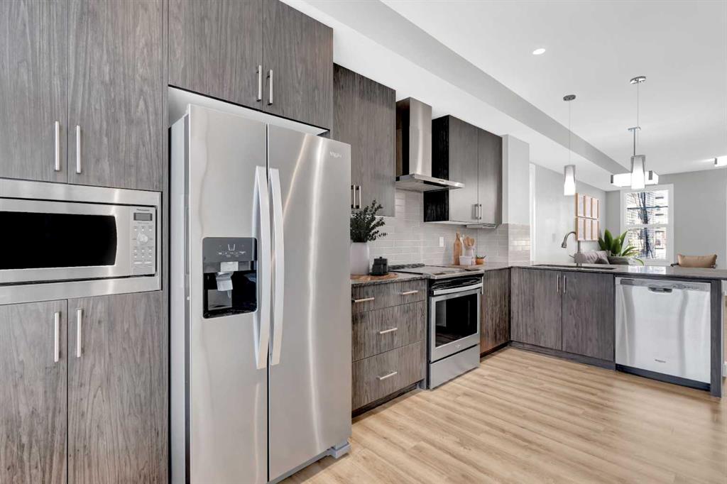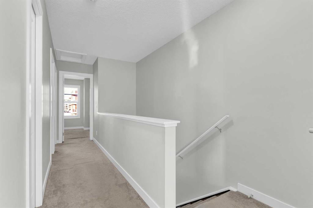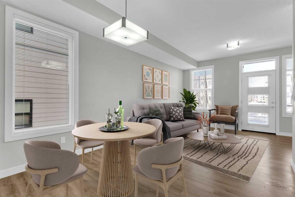 END UNIT townhome with 3 BEDROOMS | 2.5 BATHS | DOUBLE ATTACHED TANDEM GARAGE | CENTRAL A/C | TONS OF HIGH END BUILDER UPGRADES | beautifully built by Trico Homes in Calgary’s urban district SETON! Combining functionality with modern luxury, be impressed the moment you set foot the open concept main floor with natural light illuminating through the many oversized windows at every turn, you can only find in an end unit. This flows perfectly into the exquisite kitchen boasting full height cabinets, stainless steel appliances with built-in microwave, quartz countertop and flush eating bar. It seamlessly blends into the cozy dining area and spacious a living room that leads to a balcony ready for BBQs. Main floor also features 9 ft ceiling height, knockdown texture, vinyl flooring that is durable and easy to clean. A half bathroom completes this level. The upper floor offers 3 generously sized bedrooms with the master suite featuring a large walk-in closet and full ensuite. Convenient laundry is also located on the upper floor. Parking will never be a problem, thanks to the double attached tandem garage that is perfect for keeping your car warm with lots of space for storage and a utility room. This unit also has plenty of street parking and close distance to visitors parking. Maintenance-free living in a well managed complex with low condo fee. This property is strategically located within walking distance to YMCA , The South Health Campus hospital, public library, JCS High School, Cineplex Cinema, banks, grocery stores, restaurants, bars, and a huge green space! Book your showing today and don’t miss out on the opportunity to own this beautifully upgraded end unit townhome! Some photos have been virtually staged to help visualize the space ** 3D VIRTUAL TOUR AVAILABLE**