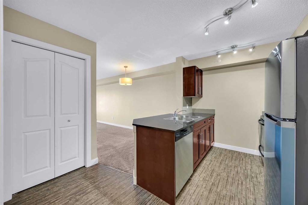 This bright top 4th-floor condo offers 507 sq. ft. of functional living space, conveniently located close to the elevator. The unit features a carpeted bedroom (8’11” × 11’4”) that fits a double size bed with side tables, a spacious living room, and a four-piece bathroom with a granite countertop sink. The kitchen boasts a granite breakfast countertop, double sink, stove, microwave, dishwasher, and a brand new fridge,. Additional highlights include a brand new in-suite washer and dryer and one titled underground parking stall (#463).
