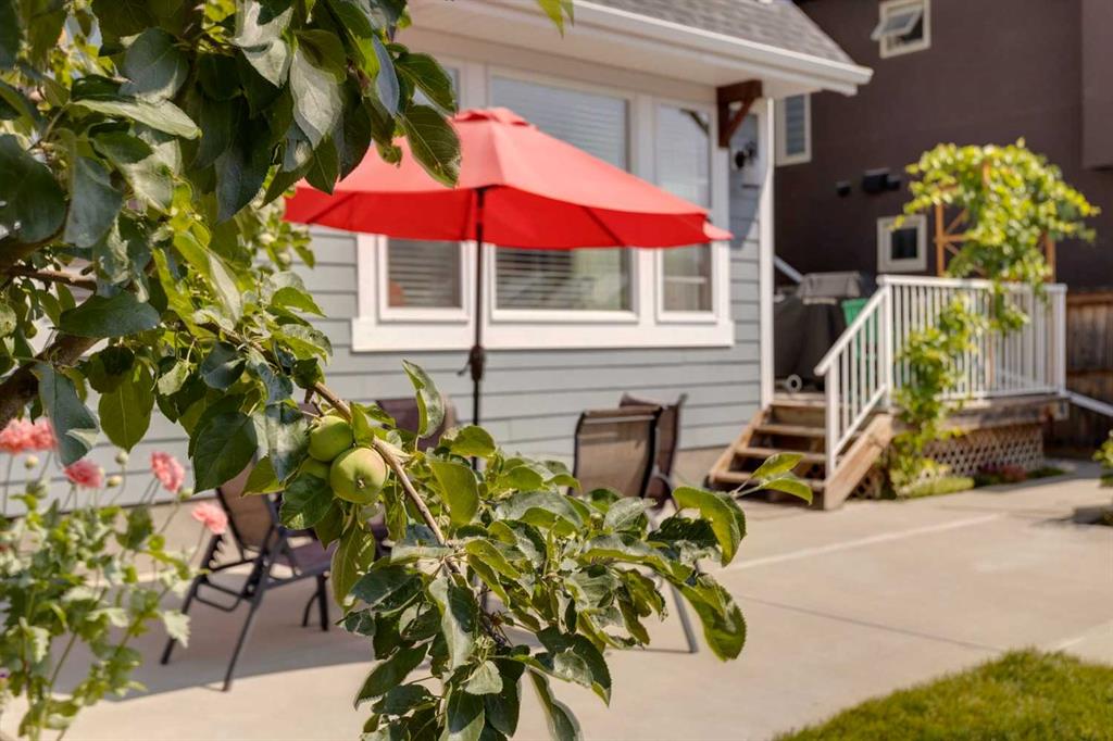 Outdoors, the south-facing backyard private yard features professional landscaping, concrete patios and walkways, a BBQ gas line, a large greenhouse, garden beds, and fruit-bearing apple trees and grapevines. The oversized double garage offers Hardy board siding, 10’4” ceilings, 220V outlets, and a built-in workbench, all accessed by a paved alley for added convenience.