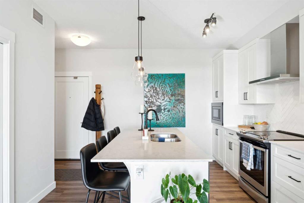 Look no further for your TOP floor unit with beautifully curated interiors and a functional layout. This unique “Pratt” layout by Logel Homes, is for the home buyer who wants a larger single bedroom and larger common areas- no small bedrooms here! Enjoy upgraded finishings like the herringbone tiled backsplash, stainless steel appliance package, trendy black pendant lights, luxury vinyl plank flooring throughout and an integrated microwave that helps the functionality of the kitchen flow seamlessly. The spacious bedroom accommodates large furniture and welcomes personal items & belongings with a walkthrough closet. Tucked past the closet is a 4-piece ensuite with a tiled bath/shower and sparkling quartz counter tops. The unit has a second bathroom for guests- offering convenience and privacy for the homeowners. Just off the cozy living room are sliding balcony doors that take you to your private outdoor hub- which includes a gas barbecue! We cannot forget to mention, one of the best features of Auburn Bay… LAKE ACCESS! Enjoy year-round exclusive access to the Home Owners Association which includes a splash park, tennis courts, a fishing dock, a boathouse, picnic tables, gymnasiums and more. Nearby services like South Health Campus (3 min drive) and grocery stores, shopping, entertainment and parks just a couple blocks away, makes Auburn Bay a community of choice for many. Complete with a titled parking stall (end stall) and an over-sized storage locker compared to other units, this is an ideal choice for vibrant living in one of Calgary’s most desired neighbourhoods. LIKE-NEW, gently lived in, this unit is truly turn-key and could be yours today! *Mortgage at 1.69% may be assumed, subject to buyer qualification and lender approval. Please contact listing agent for details.