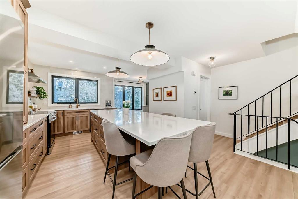 Hello, Gorgeous! Welcome to 42 Point Drive NW in the sought-after river community of Point McKay. This beautifully renovated townhome offers 1,368 sq ft of above-grade living space with 2 bedrooms and 3 bathrooms in a thoughtfully designed multi-level layout. Backing directly onto peaceful greenspace with a west-facing outdoor area, this home offers rare privacy while being just steps from the Bow River pathway system and minutes to downtown Calgary. Inside, extensive upgrades create a modern and comfortable interior, including a custom chef’s kitchen with designer drawer layout, newer appliances with induction stove, luxury vinyl flooring throughout, and stylish designer lighting. The bright living area features a tiled gas fireplace and large triple-glazed windows that bring in abundant natural light, while a sliding patio door provides seamless access to the outdoor space. Upstairs, two spacious bedrooms include a primary retreat with walk-in closet and a beautifully appointed ensuite featuring heated floors and high-end fixtures. Mechanical and infrastructure updates include all new plumbing with copper removed, triple-glazed windows and patio door, updated furnace, hot water on demand, electrical upgrades, smart thermostat, and hardwired smoke detectors. The unfinished basement provides additional storage and future potential. Additional features include an attached garage, custom built-ins, wine storage, and landscaped front garden with perennials. Located in one of Calgary’s most unique inner-city communities, this home offers easy access to river pathways, parks, Foothills Hospital, the University of Calgary, and downtown, making it an ideal opportunity for professionals, downsizers, or anyone seeking an active lifestyle close to nature and the city.