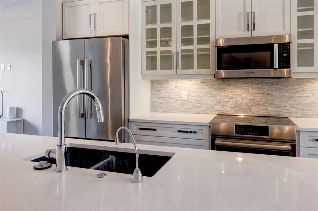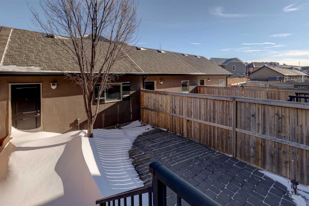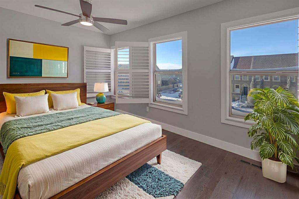 A rare find—townhome living with NO CONDO FEES! This beautifully upgraded home features 9-foot ceilings on the main floor, rich hardwood flooring, & quartz countertops on both the main & upper levels. The open-concept main floor offers spacious living & dining areas framed by elegant windows, while the upgraded kitchen is a true standout. Highlights include high-end Bosch stainless steel appliances, a large centre island with white quartz countertops, under-cabinet lighting, soft-close drawers & doors, & full-height cabinetry for a sleek, modern finish. A rear mud room keeps the family boots & coats organized while the beautiful living, dining & kitchen spaces are perfect for entertaining & family living. Upstairs, hardwood flooring continues throughout, leading to two generously sized bedrooms, each with large closets & custom built-in organizers. The ensuite bathroom is finished with quartz countertops & upgraded counter-to-ceiling mirrors, while the second full bathroom features quartz counters & a tub/shower combination. A conveniently located upper-level laundry room completes this floor. The fully developed basement adds exceptional versatility, offering a flex space ideal for a bedroom, gym, or home theatre, along with an additional full bathroom & abundant storage. Outside, enjoy your private, low-maintenance backyard with stone patio, plus a double detached garage. Additional upgrades include enhanced faucets, lighting, & interior doors, 2.5-inch plantation shutters throughout, air conditioning, new washer & dryer (2025), new hail-resistant shingles, eavestroughs, & downspouts (2025). Ideally located steps from pathways, playgrounds, grocery stores, restaurants, coffee shops, banks, & more, this exceptional home truly checks every box. A must-see!