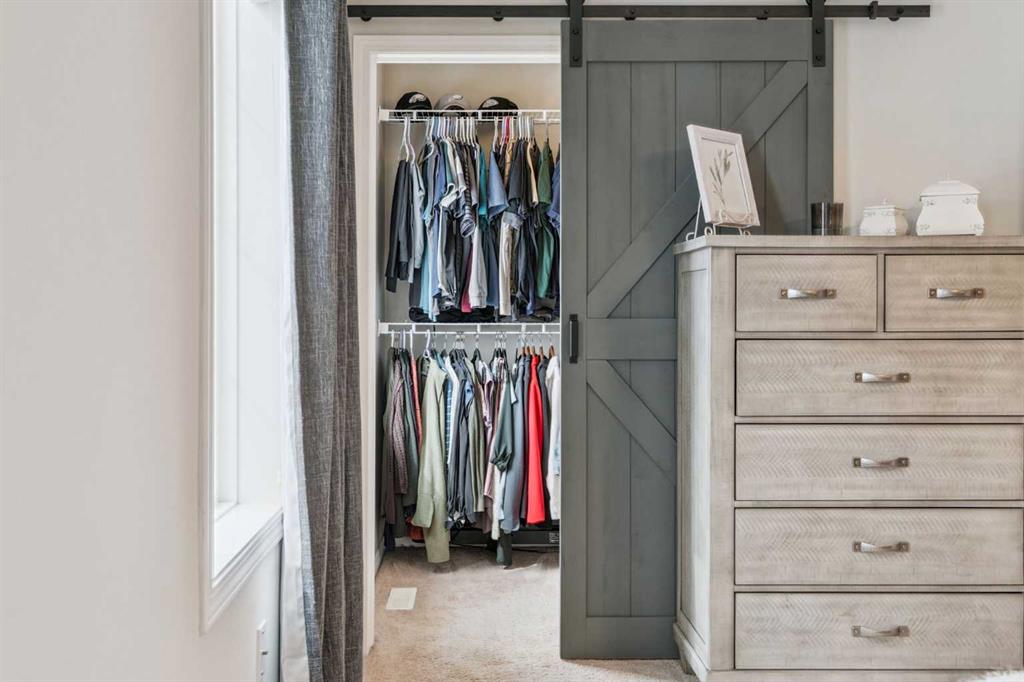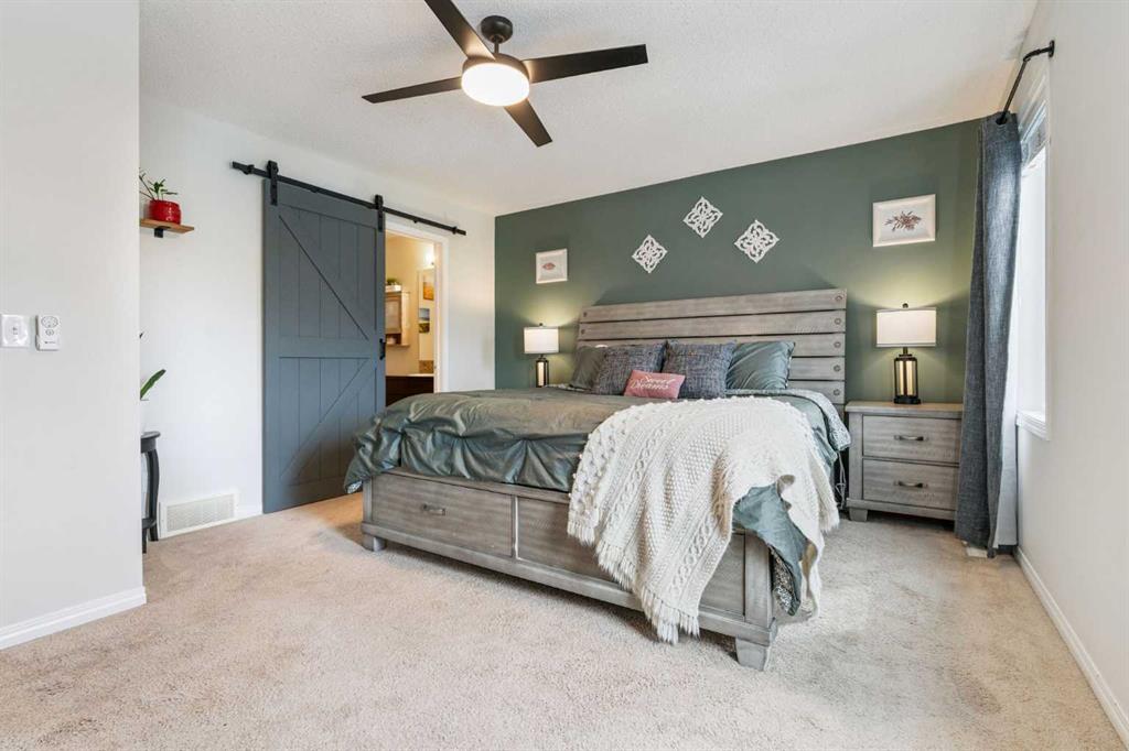 The main floor is filled with natural light and features a well-designed open layout with backyard views from the living room. The kitchen offers ample cupboard and counter space, complemented by updated stainless steel appliances, including a gas stove—perfect for cooking and entertaining. Updated lighting, faux wood blinds throughout, ceiling fans in all bedrooms, solid core doors on bedrooms and bathrooms, wainscotting in the half bath, and a stylish barn doors leading to both the primary walk-in closet and ensuite add modern touches throughout.