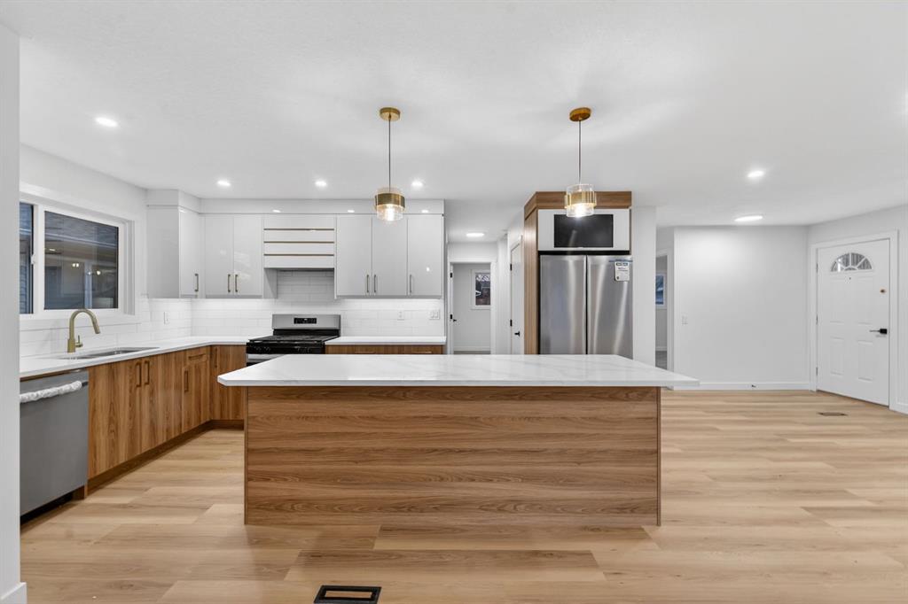 Rare opportunity featuring two illegal suites with separate entrance, ideal for investors, multi-generational living, or potential rental income. Welcome to 420 Pinegreen Close, located on a quiet street in the desirable community of Pineridge, within walking distance to schools, parks, and shopping. This cozy home comes fully renovated; equipped with appliances, new windows, security system, custom cabinetry and more, making this house move in ready! You’re greeted by a striking custom LED wood panel, setting a timeless tone. Stepping into this beautifully renovated home, a bright, open floor plan immediately welcomes you in. The heart of the home is the brand-new custom kitchen, featuring sleek cabinetry, new high end appliances, a massive island, and a built-in screen for convenient monitoring of the security cameras. The open-concept design flows seamlessly from the kitchen to the dining and living area, creating an ideal space for everyday living and entertaining. Within the main living area is a custom multimedia nook with built-in cabinetry and a stylish electric fireplace, offering a cozy yet modern retreat that blends function with comfort. On the same level the home also offers a fully renovated four-piece bathroom with modern tile finishes, three thoughtfully designed bedrooms, with the primary suite enhanced with custom cabinetry for smart, streamlined storage. Adding exceptional value, this home features two fully renovated illegal suites, with a separate entrance. Thoughtfully updated and move-in ready, these suites present a rare opportunity for flexible living and income potential in a modern setting. Both suites include new kitchens, updated appliances, and contemporary finishes throughout. Illegal Suite #1 offers a spacious two-bedroom layout with a modern four-piece bathroom, while Illegal Suite #2 features a comfortable one-bedroom design with a three-piece bathroom. The exterior is equally impressive, finished with a modern combination of Smart Board and vinyl siding for a clean, contemporary look. Set on a generous lot, the home offers a large yard with plenty of space for outdoor living, entertaining, or future possibilities, perfectly complementing the home’s modern upgrades inside and out. Book a showing today to experience the value of this rare gem!
