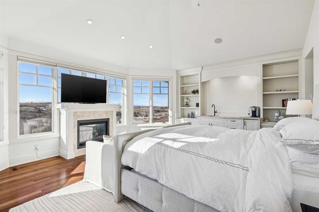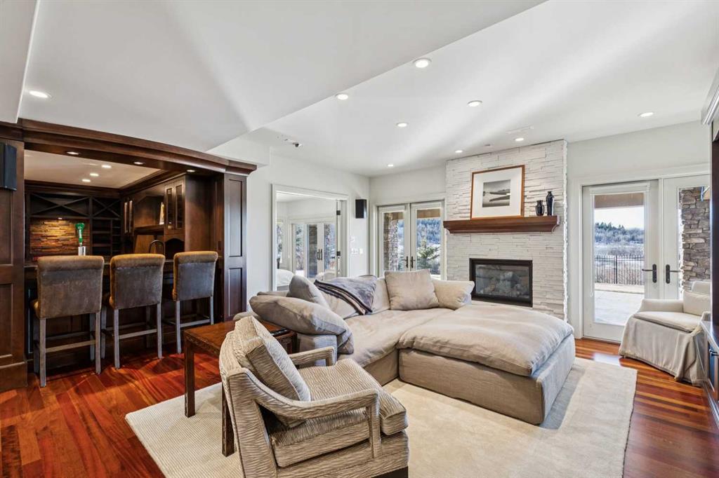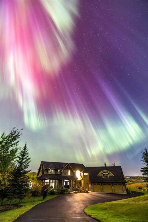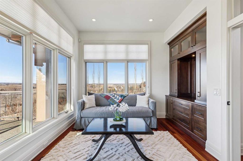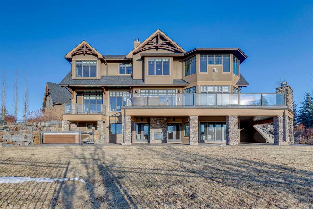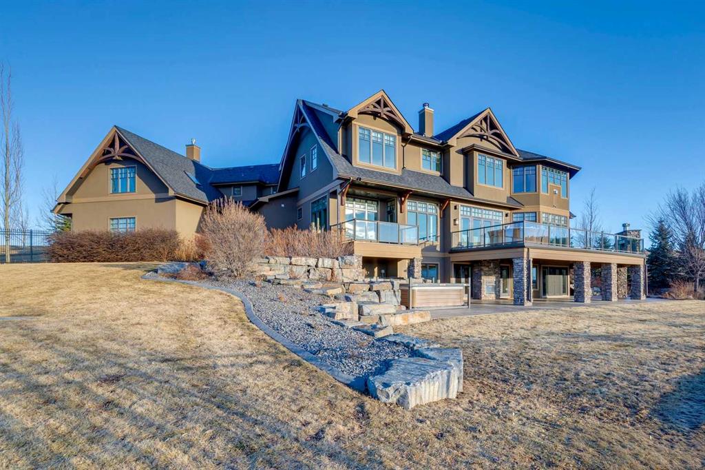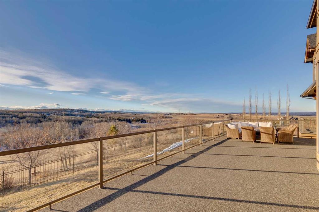 Set on over 4.5 acres this extraordinary John Haddon-designed estate captures commanding mountain and city views from nearly every vantage point. Backing onto a protected environmental reserve and located within Foothills County’s celebrated “Dark Sky Country” nocturnal preserve. The property offers an unparalleled blend of privacy, luxury, and natural beauty while remaining remarkably connected. Calgary’s Stoney Trail is less than 10 minutes away, Priddis Greens Golf Course is nearby & the Rocky Mountains are an easy drive from your doorstep. A grand solid oak entry door welcomes you into a breathtaking main level defined by soaring 10-foot ceilings and cinematic west-facing views. Timeless cherry oak hardwood flooring, exquisite millwork, and custom cabinetry establish a tone of refined craftsmanship throughout. The chef’s kitchen is a true showpiece, featuring a fully integrated Sub-Zero refrigerator, iconic Wolf gas range + pot filler, and an impressive island with breakfast nook positioned to capture panoramic vistas along the back of the home. Multiple access points lead to the expansive deck, where a stunning gas/wood-burning outdoor fireplace creates the ultimate setting for year-round entertaining. The formal dining room is elegantly situated at the front of the home, encircled by panoramic windows and complemented by direct access to a walk-in butler’s pantry. An elongated office/den provides the flexibility and tranquility ideal for working from home or enjoying a quiet retreat. A striking open-riser staircase leads to the thoughtfully designed upper level. Three spacious ensuite bedrooms each feature walk-in closets, while the show-stopping primary suite offers a private sanctuary complete with dual expansive walk-in closets, separate vanities, a luxurious soaker tub, and a spa-inspired body-jetted shower. Above the garage, a one-of-a-kind private illegal suite with direct access to the laundry room offers the perfect arrangement for a nanny, housekeeper, or extended family. The walkout basement fully capitalizes on the home’s gently sloping lot and spectacular western exposure. An additional bedroom includes its own walk-in closet and full ensuite, a gym—currently utilized as a bedroom—opens through sliding doors to an elevated hot tub perfectly positioned for breathtaking sunset mountain views. A sauna, and steam shower—creating a true private resort experience. Designed for recreation and relaxation, the lower level features 9-foot ceilings, in-floor heating, a wet bar with beer tap, pool table and media area. Additional highlights include epoxy-finished floors in the heated four-car garage, beautifully landscaping enclosed by elegant iron fencing, a comprehensive HVAC upgrade within the past four years. This is a rare opportunity to own a timeless architectural masterpiece where luxury estate living meets untouched nature & surroundings within proximity to the numerous amenities. Property Video under Virtual Tour.