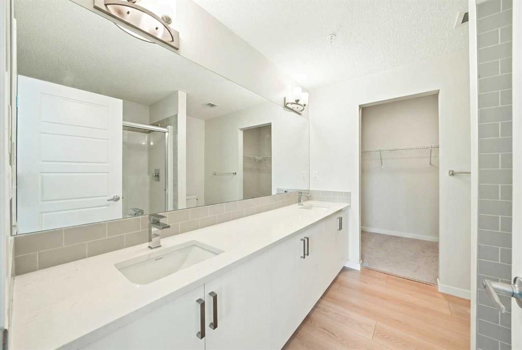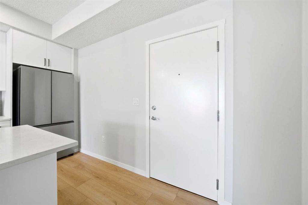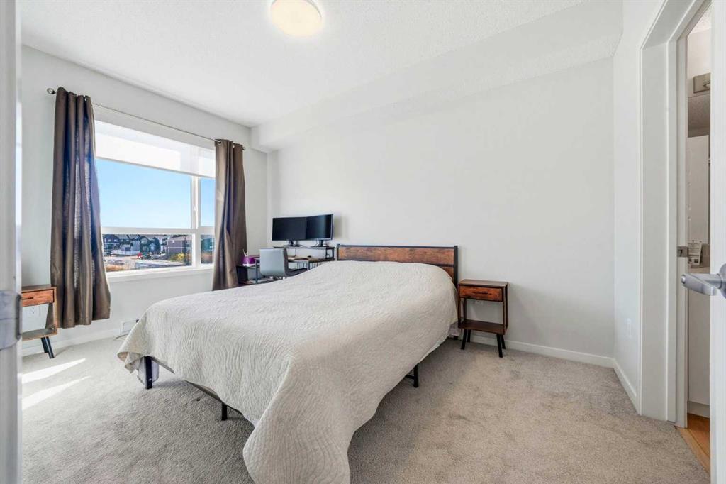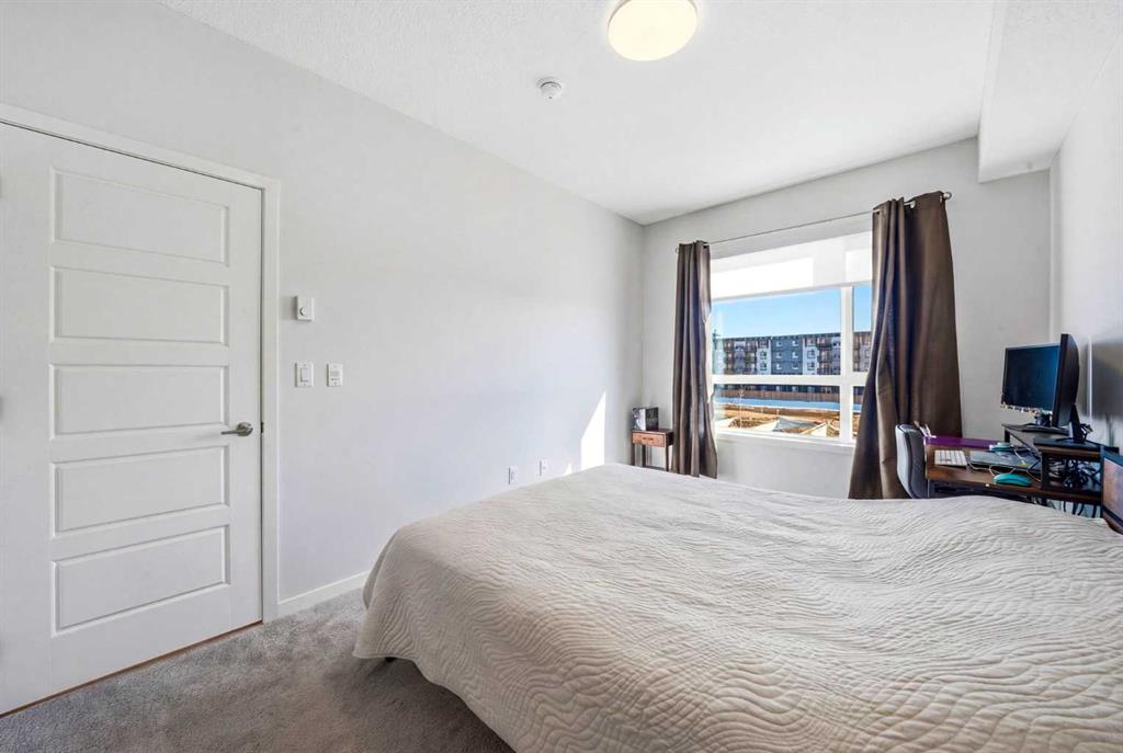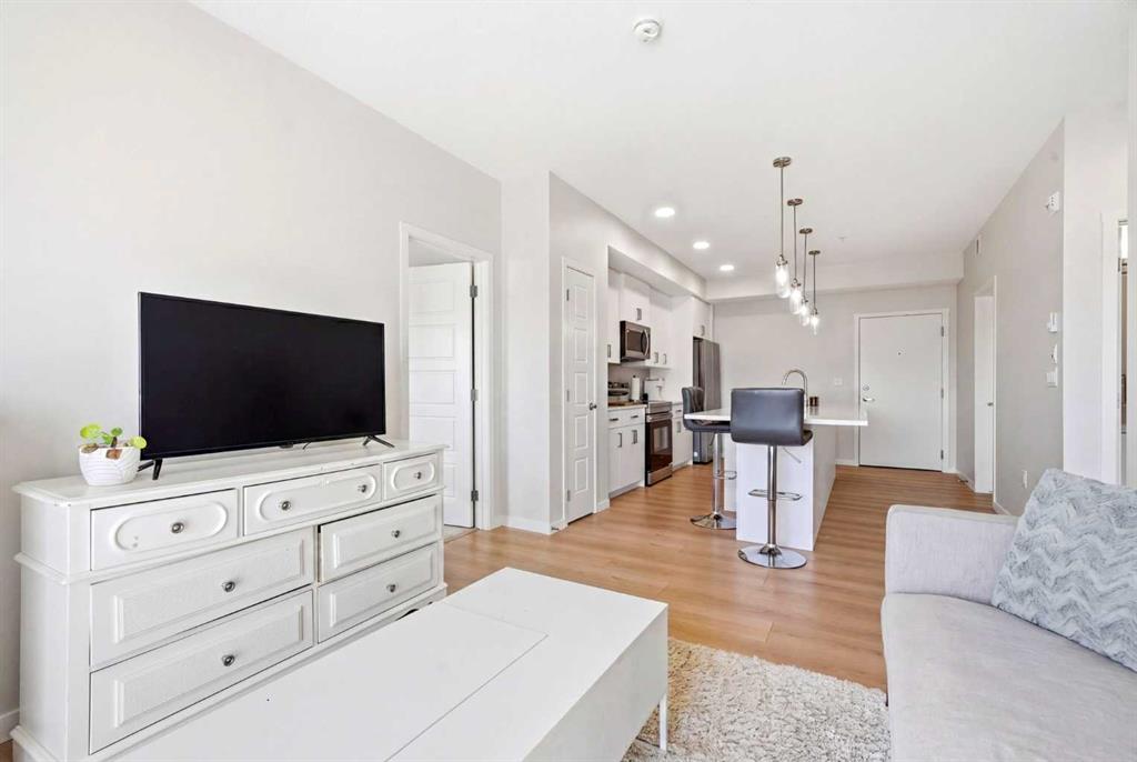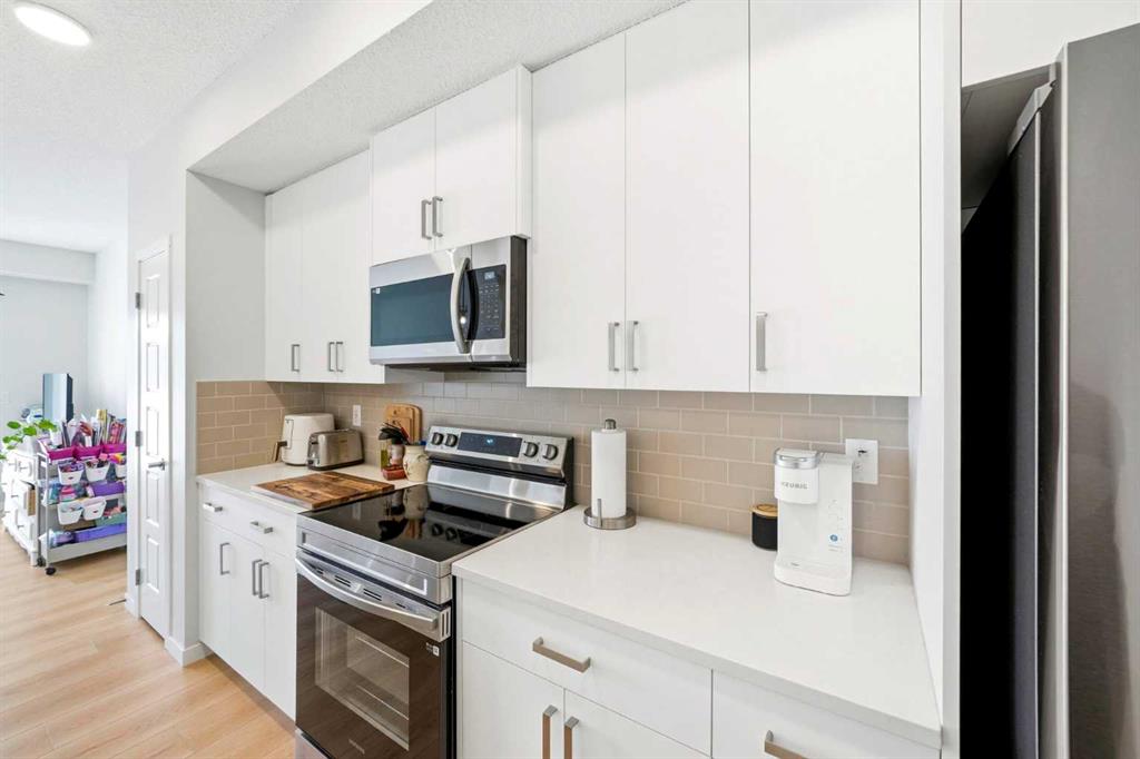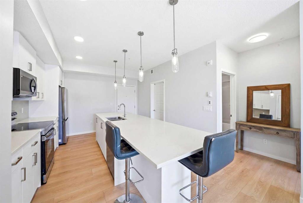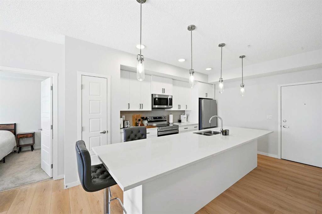 The heart of the home is a beautifully designed open-concept kitchen featuring sleek quartz countertops, premium stainless steel appliances, and an expansive island with an integrated sink, ideal for entertaining, casual dining, or gathering with family and friends. Designer pendant lighting and clean, contemporary cabinetry add a refined touch to the space. The spacious primary bedroom offers a peaceful retreat with plush carpeting, generous windows, and direct access to a private ensuite. A well appointed second bedroom provides flexibility for guests, a home office, or growing families. Enjoy the convenience of a walk-in closet and an oversized laundry room with ample additional storage, perfect for keeping everything organized and out of sight. Additional features include secure underground parking, modern finishes throughout, and a thoughtfully designed layout that maximizes both style and functionality. Located in the vibrant and rapidly expanding community of Belmont, this home offers a walkable lifestyle surrounded by parks, playgrounds, and beautiful green spaces just steps from your door. Enjoy the convenience of nearby shops, restaurants, and everyday essentials, with even more on the horizon.