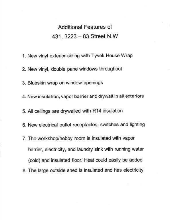 This charming home in the popular Greenwood Village community comes with numerous upgrades! It features a spacious eat-in kitchen with stunning knotty pine cabinetry, attractive laminate flooring, and two fireplaces that keep the space cozy during winter, complemented by a refurbished gas furnace rarely used by the current owner. The home offers a large living room, a great dining area in the kitchen, a generously sized primary bedroom, and a roomy second bedroom, making it a comfortable place to live. Upgrades include new exterior vinyl siding with Tyvek House Wrap, upgraded insulation, new drywall throughout, double-pane vinyl windows, new electrical outlets, switches, and lighting. There’s also a fantastic workshop/hobby room with insulation, electricity, running water, and an insulated floor, easily accessible from inside the home. The large shed is also insulated and has electricity. The private backyard is perfect for BBQs, family gatherings, and gardening, with ample additional storage. Conveniently located across the alley from the new Farmer’s Market, this affordable home offers easy access to the mountains and is just minutes from the ski hill at Calgary Olympic Park.