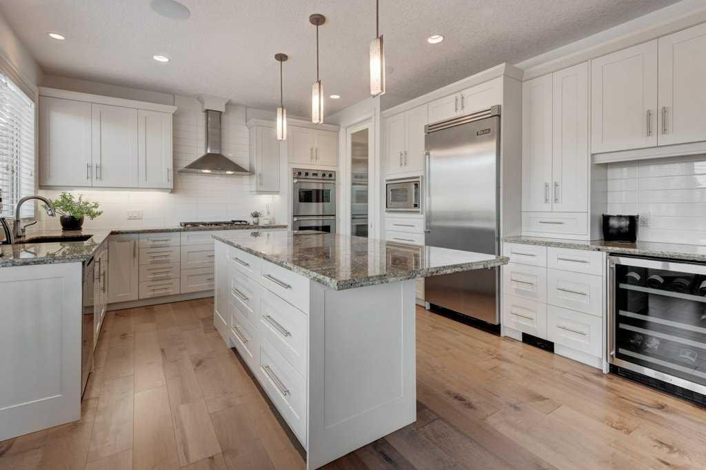 At the heart of the home is a beautifully designed kitchen with a large granite-topped island with breakfast bar seating, pendant lighting, dual ovens and fridges, gas range, wine fridge, and ample cabinetry. You’ll find a dedicated coffee station and a walk through pantry. A private office, powder room, laundry area, and mudroom off the double garage complete this well-appointed level.