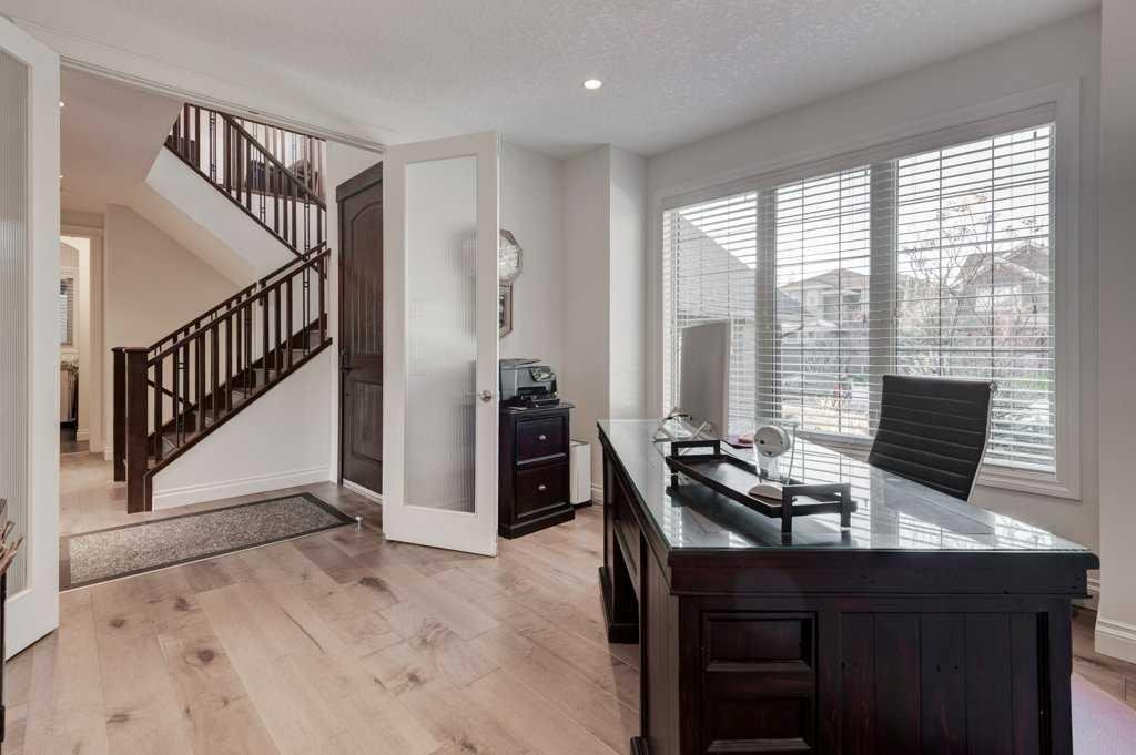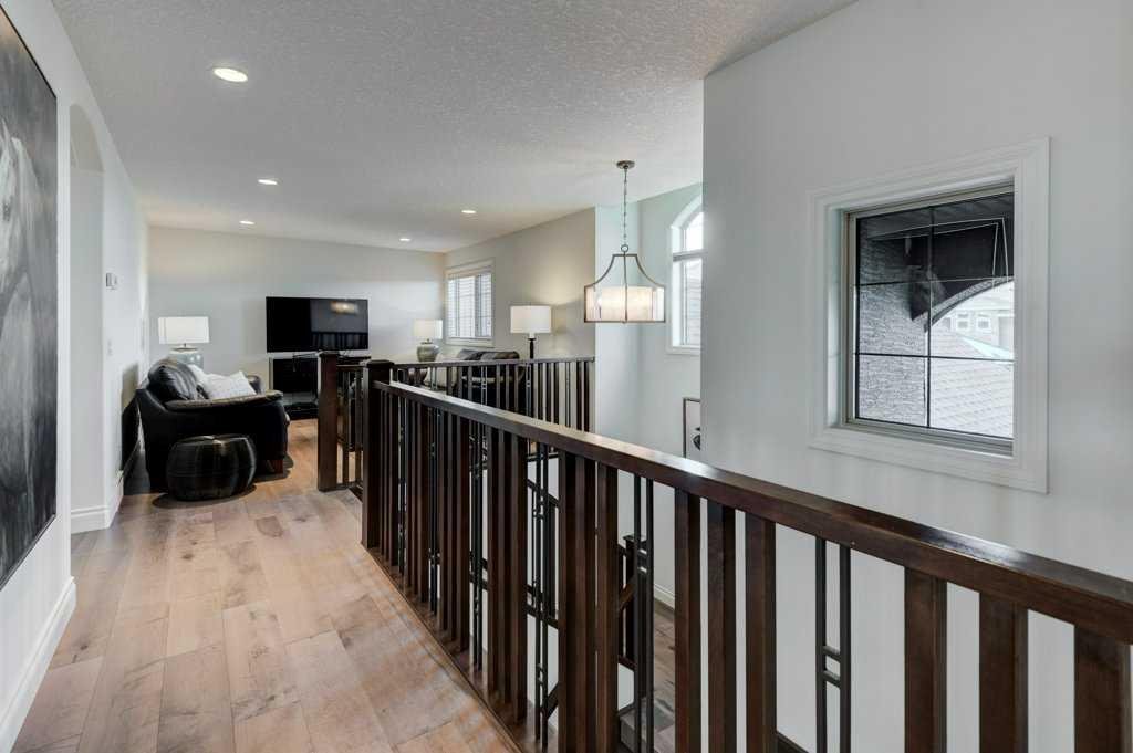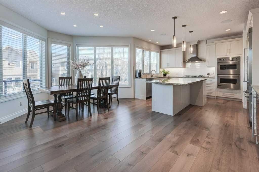 Welcome to 436 Evergreen Circle SW, an elegant, family-friendly home with thoughtful design and a luxurious feel. From the moment you step inside, the open layout, engineered hardwood throughout, and abundance of natural light make a lasting impression. The main floor features a generous living room anchored by a stone-surround fireplace and custom built-ins, perfect for cozy evenings or entertaining. A wall of windows leads into the bright dining area and out onto a raised balcony, ideal for morning coffee or summer BBQs.