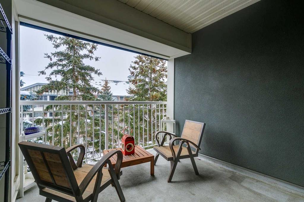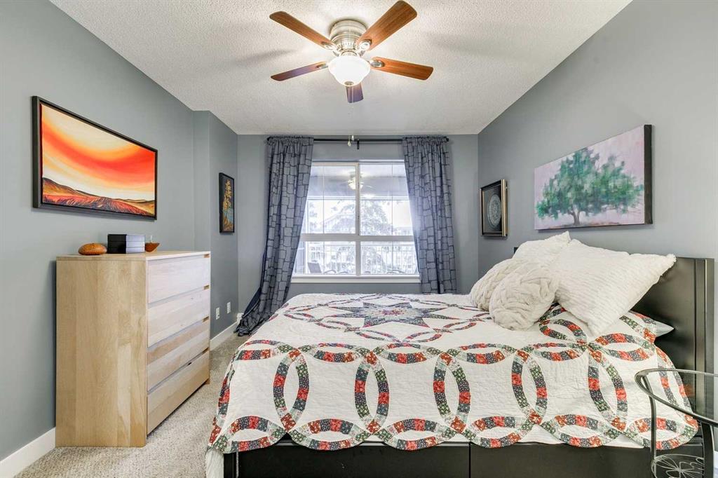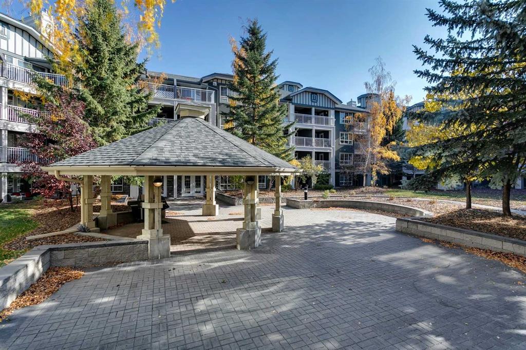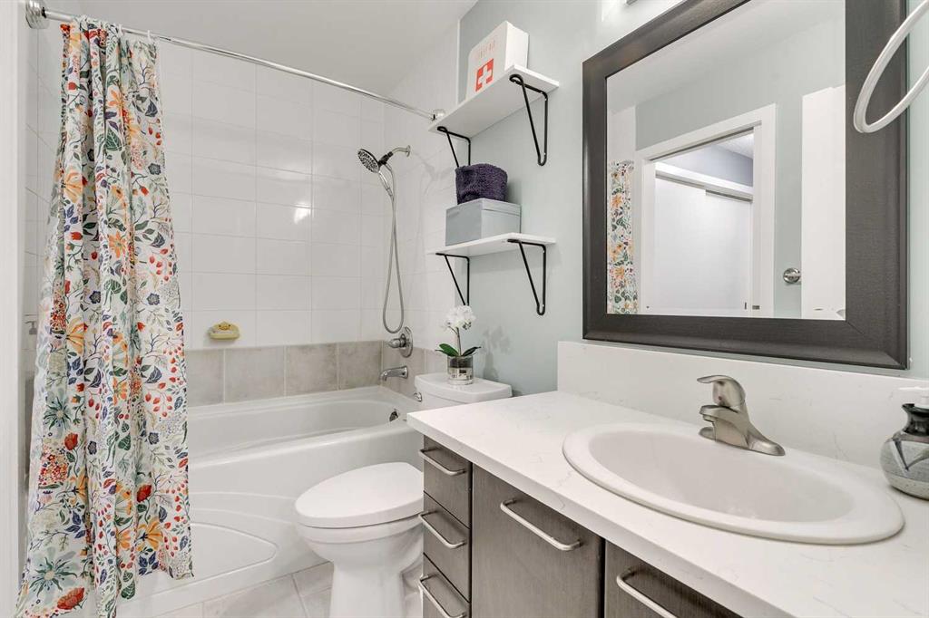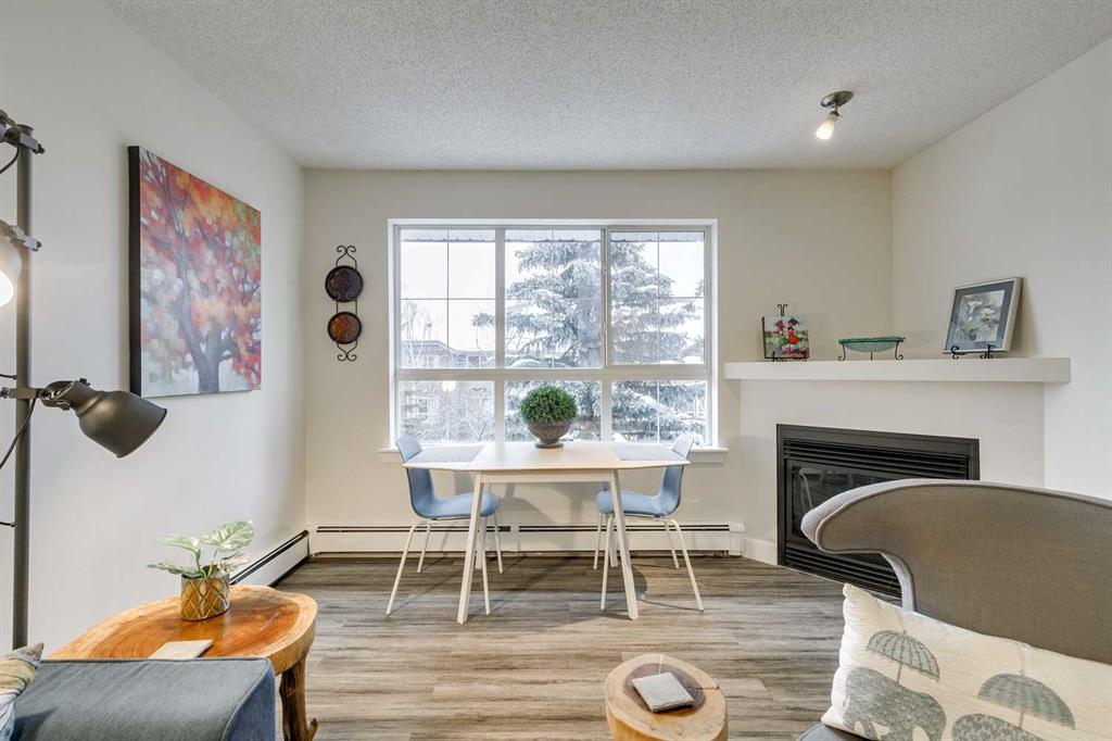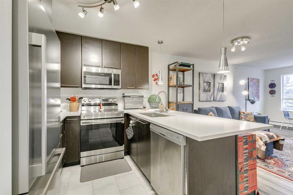 Tranquil top floor unit facing mature trees will help all your dreams come true in this 1-bedroom residence, ideally positioned in the heart of Lincoln Park, just steps from Mount Royal University & amenities. Whether you’re a discerning student, faculty member, or strategic investor, this sanctuary offers an unmatched lifestyle & opportunity. Thoughtfully updated, the home features a super functional kitchen with new fridge, stove, washer & dryer. Culinary enthusiasts will appreciate the gourmet kitchen, boasting cabinetry to the ceiling, and an impressive 8-foot quartz breakfast bar. Step outside onto the private 10′ x 8′ covered patio, an idyllic setting for your morning coffee or evening grilling with convenient gas BBQ hookup. Open-concept layout is both functional and inviting, enhanced by a dedicated den/office that truly has enough space to use for function. A charming corner gas fireplace anchors the living space, complemented by luxury vinyl plank flooring for a contemporary finish. The bedroom is a serene retreat, complete with plush carpeting, a ceiling fan, a generous double walk-in closet, and access to the beautifully updated 4-piece cheater ensuite with new tower shelf, curved shower rod, and a quartz vanity with elevated fixtures. Titled underground parking stall accompanies the unit—an invaluable feature in this sought-after building. You can also offer your guests underground visitor parking for their convenience. Residents of this impeccably maintained, pet-friendly building enjoy premium amenities, including a fully equipped fitness centre, a party room, and two guest suites for company so they can visit in comfort. Additional perks include secure storage locker, multiple bike storage rooms, and TELUS PureFibre connectivity for seamless, high-speed internet throughout. More than just a home, this exceptional property offers a refined, turnkey lifestyle in one of Calgary’s most desirable southwest communities.