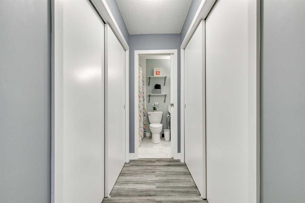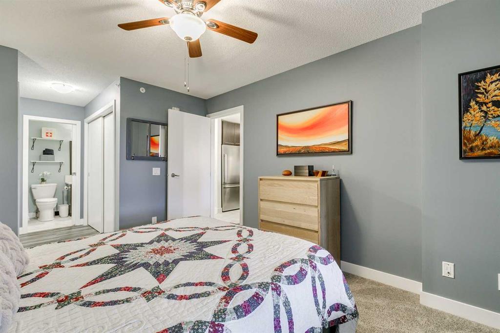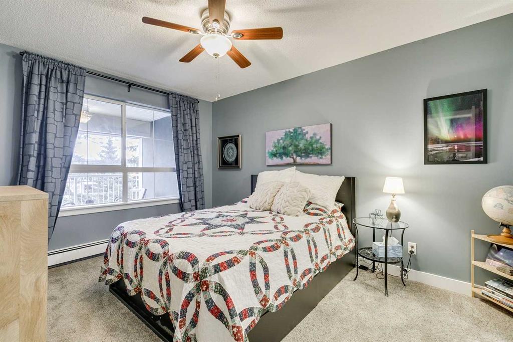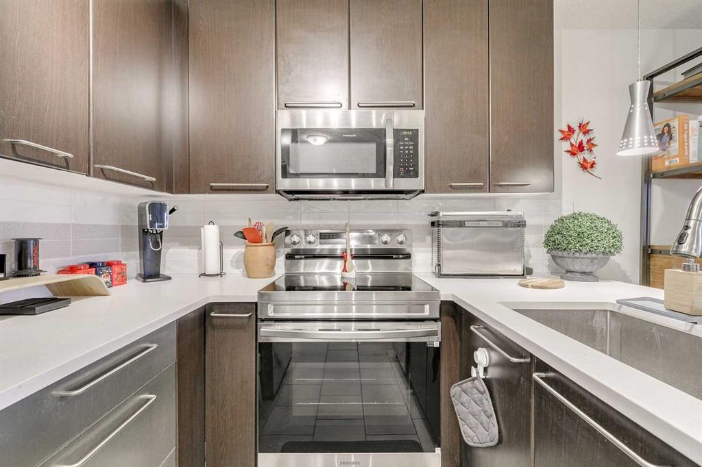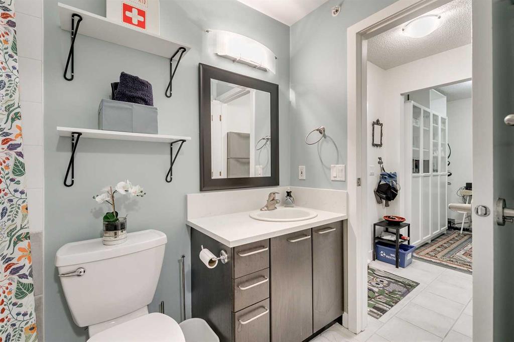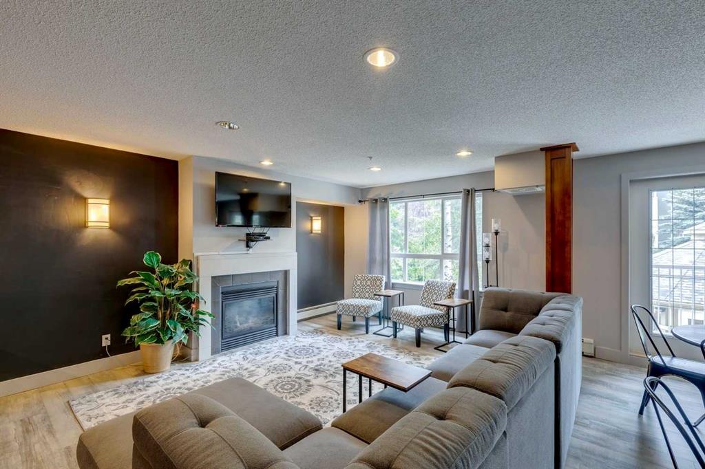 Tranquil top floor unit facing mature trees will help all your dreams come true in this 1-bedroom residence, ideally positioned in the heart of Lincoln Park, just steps from Mount Royal University & amenities. Whether you’re a discerning student, faculty member, or strategic investor, this sanctuary offers an unmatched lifestyle & opportunity. Thoughtfully updated, the home features a super functional kitchen with new fridge, stove, washer & dryer. Culinary enthusiasts will appreciate the gourmet kitchen, boasting cabinetry to the ceiling, and an impressive 8-foot quartz breakfast bar. Step outside onto the private 10′ x 8′ covered patio, an idyllic setting for your morning coffee or evening grilling with convenient gas BBQ hookup. Open-concept layout is both functional and inviting, enhanced by a dedicated den/office that truly has enough space to use for function. A charming corner gas fireplace anchors the living space, complemented by luxury vinyl plank flooring for a contemporary finish. The bedroom is a serene retreat, complete with plush carpeting, a ceiling fan, a generous double walk-in closet, and access to the beautifully updated 4-piece cheater ensuite with new tower shelf, curved shower rod, and a quartz vanity with elevated fixtures. Titled underground parking stall accompanies the unit—an invaluable feature in this sought-after building. You can also offer your guests underground visitor parking for their convenience. Residents of this impeccably maintained, pet-friendly building enjoy premium amenities, including a fully equipped fitness centre, a party room, and two guest suites for company so they can visit in comfort. Additional perks include secure storage locker, multiple bike storage rooms, and TELUS PureFibre connectivity for seamless, high-speed internet throughout. More than just a home, this exceptional property offers a refined, turnkey lifestyle in one of Calgary’s most desirable southwest communities.