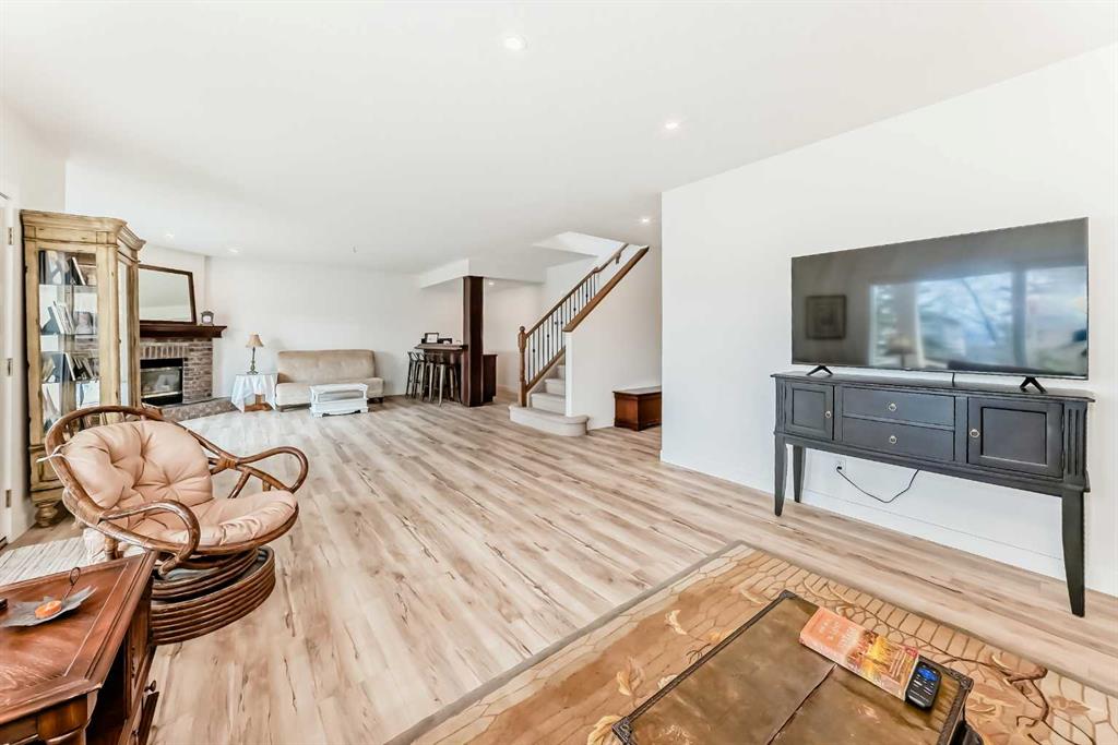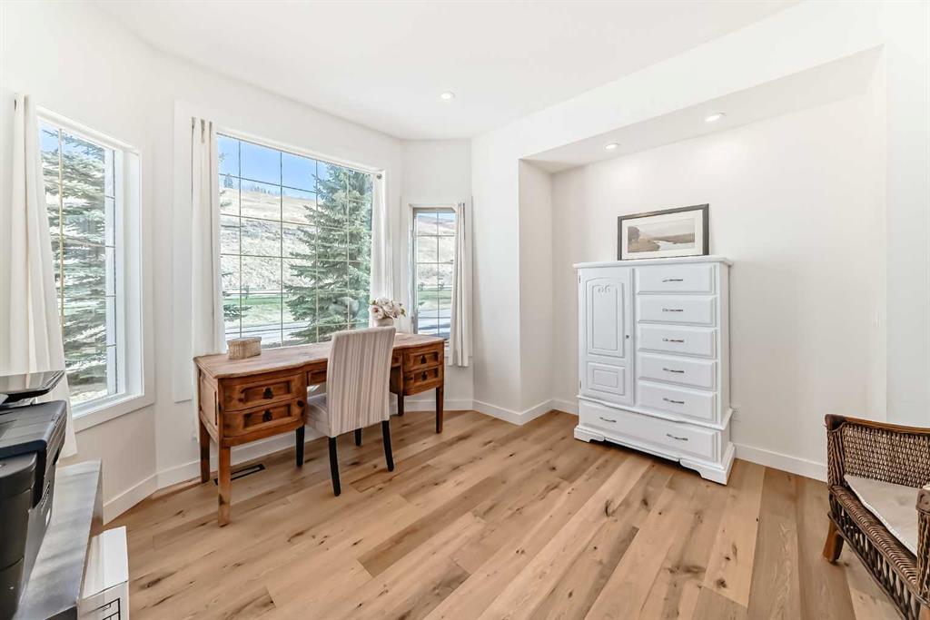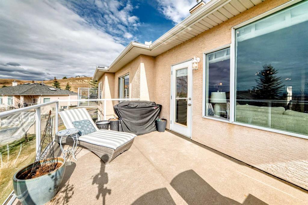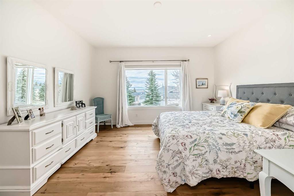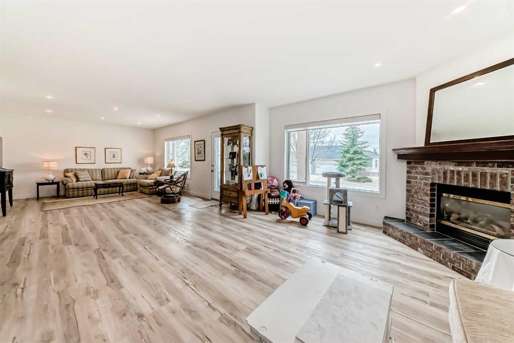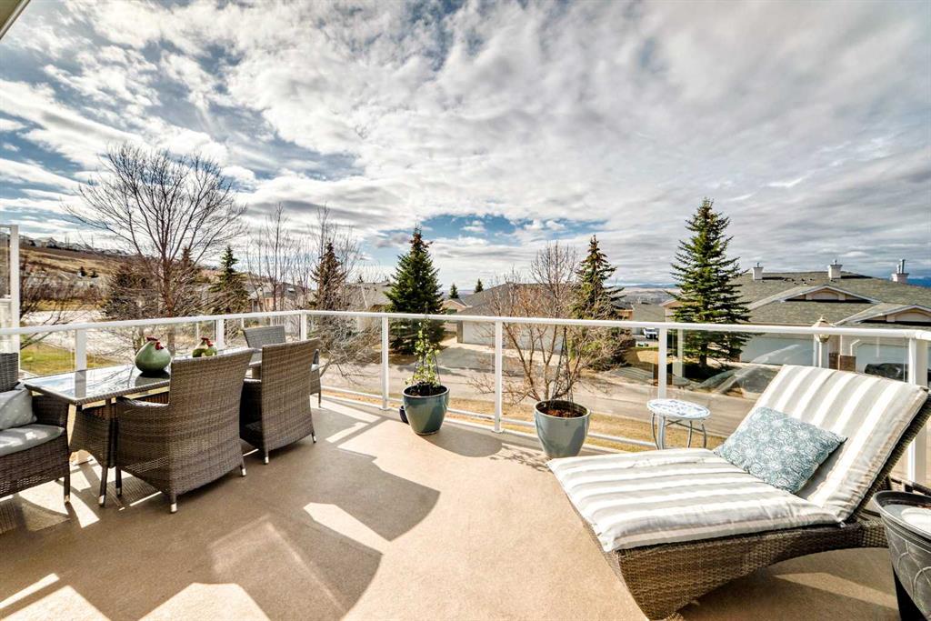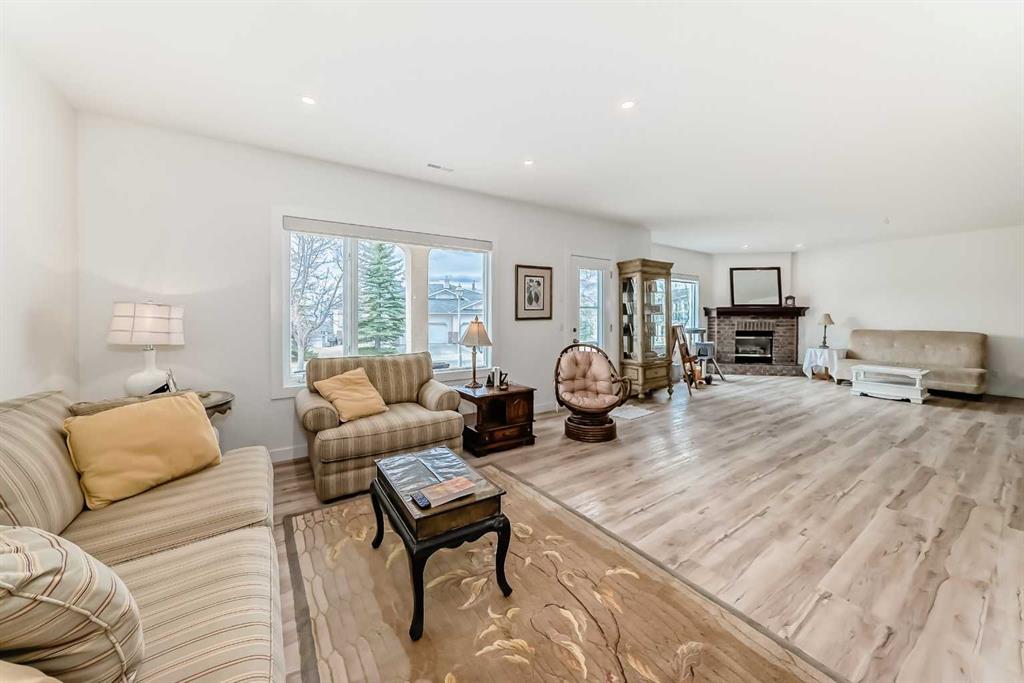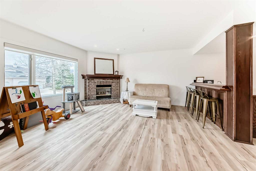 The main living area is warm and inviting with hardwood flooring and a cozy gas fireplace, creating the ideal space for both relaxing and entertaining. The primary bedroom is a true retreat, complete with a walk in closet and a luxurious 5 piece ensuite. The fully finished basement offers exceptional additional living space with in floor heating and a second fireplace. Completing the space is a wet bar, full 4 piece bathroom and two additional bedrooms, making it ideal for guests or extended family. Outside, enjoy a spacious backyard with lush grass and a concrete deck. The heated double garage adds year round convenience and comfort. Situated in a peaceful, scenic neighbourhood known for its quiet atmosphere and proximity to golf, pathways, and easy access to Calgary and the mountains.