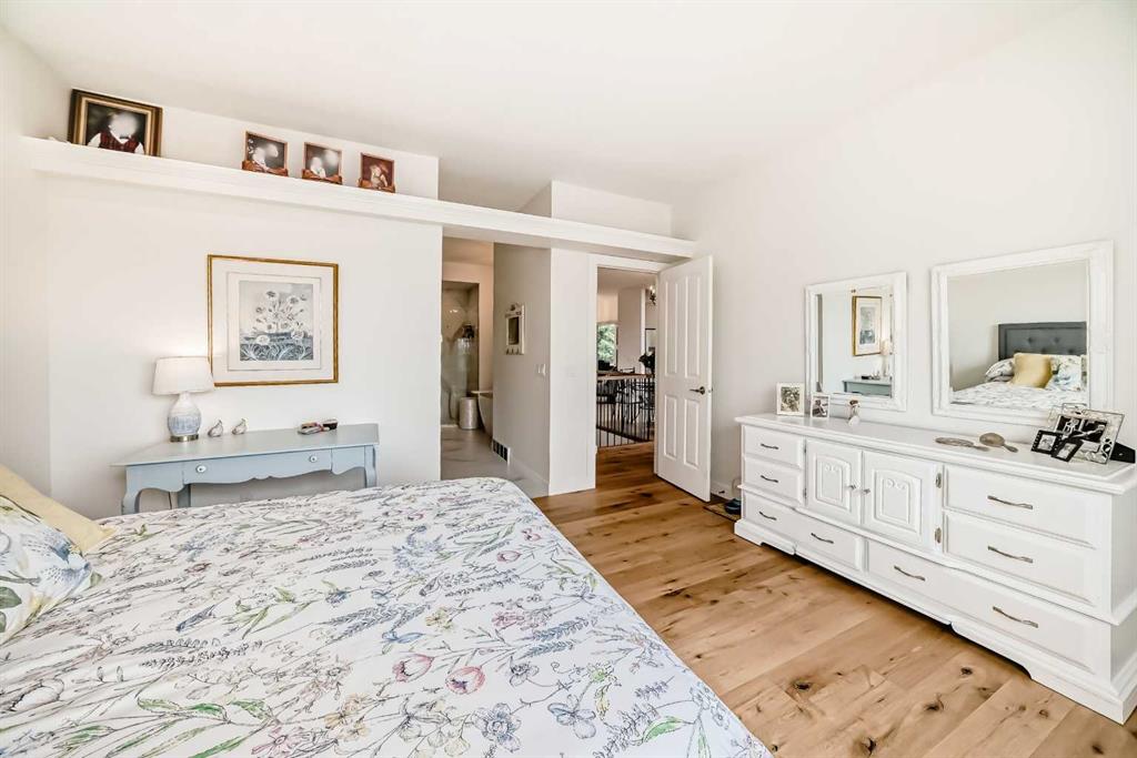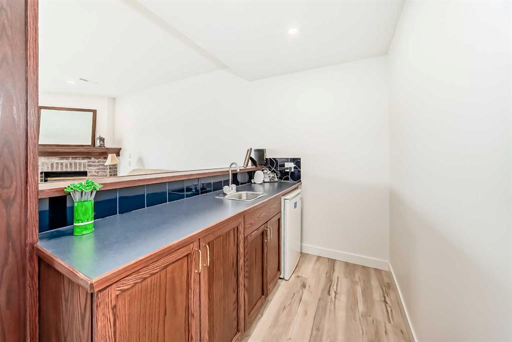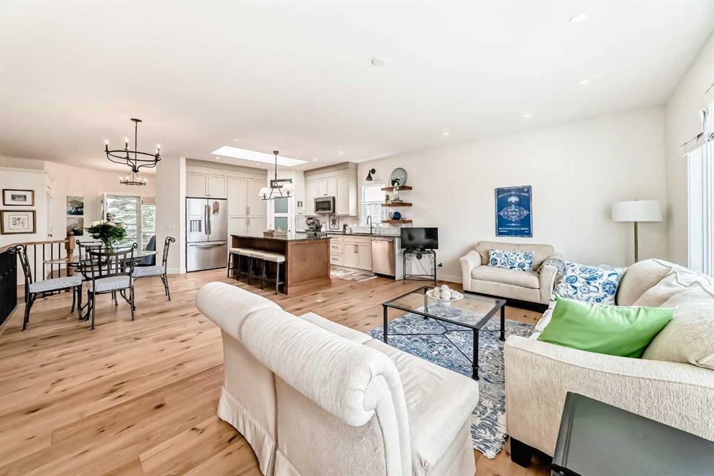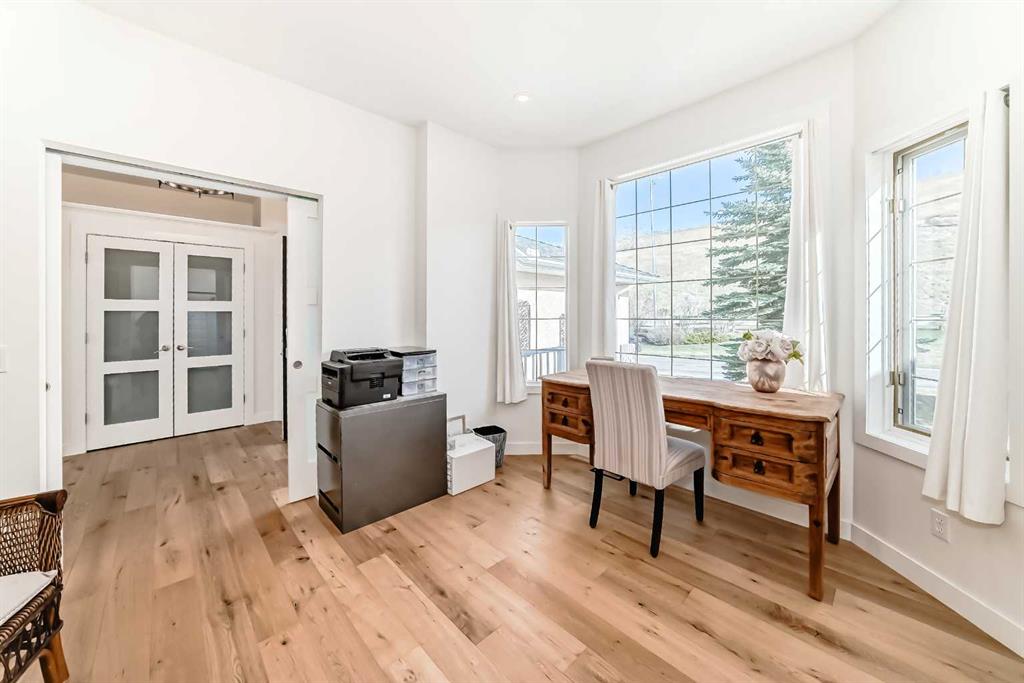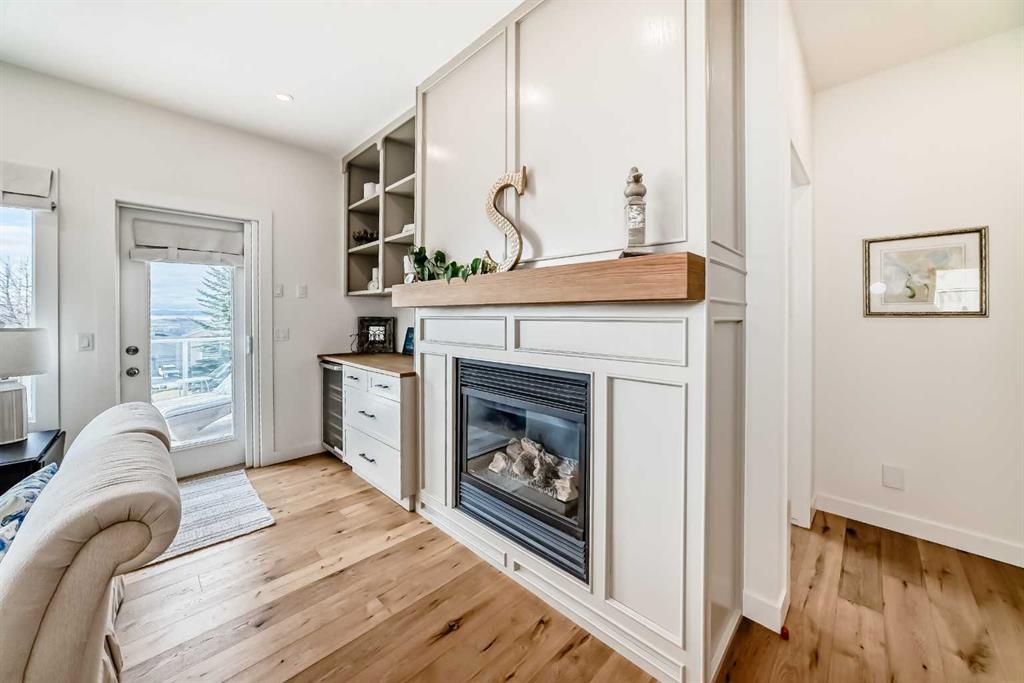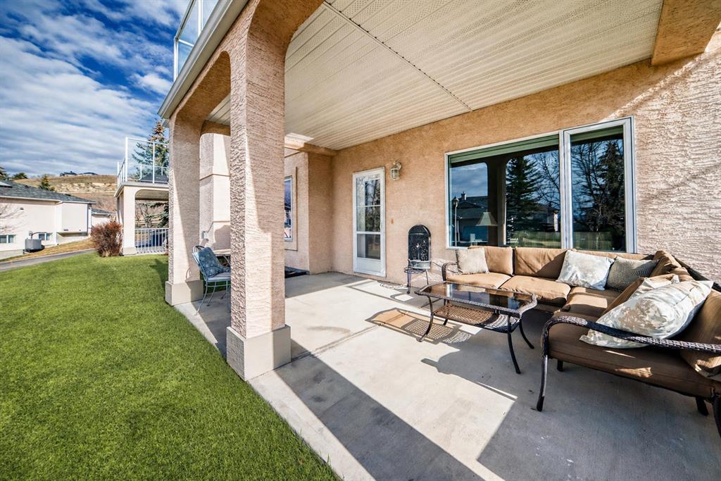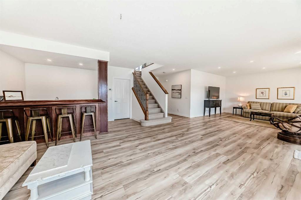 The main living area is warm and inviting with hardwood flooring and a cozy gas fireplace, creating the ideal space for both relaxing and entertaining. The primary bedroom is a true retreat, complete with a walk in closet and a luxurious 5 piece ensuite. The fully finished basement offers exceptional additional living space with in floor heating and a second fireplace. Completing the space is a wet bar, full 4 piece bathroom and two additional bedrooms, making it ideal for guests or extended family. Outside, enjoy a spacious backyard with lush grass and a concrete deck. The heated double garage adds year round convenience and comfort. Situated in a peaceful, scenic neighbourhood known for its quiet atmosphere and proximity to golf, pathways, and easy access to Calgary and the mountains.