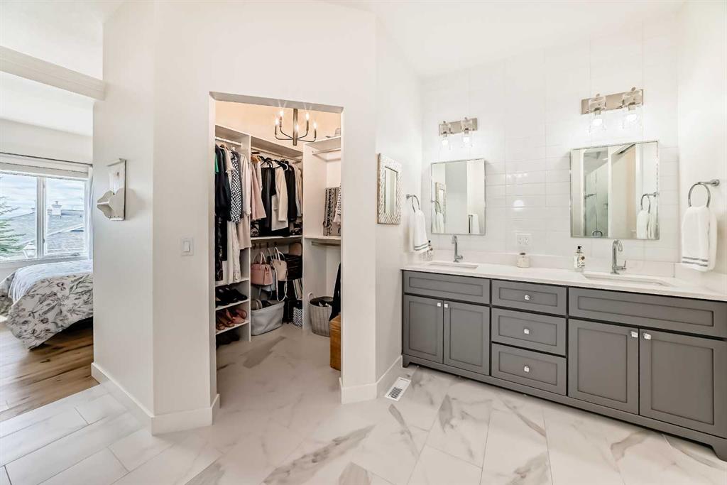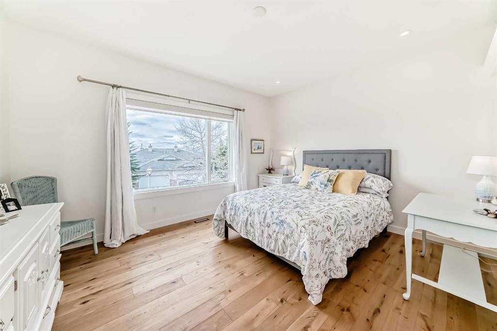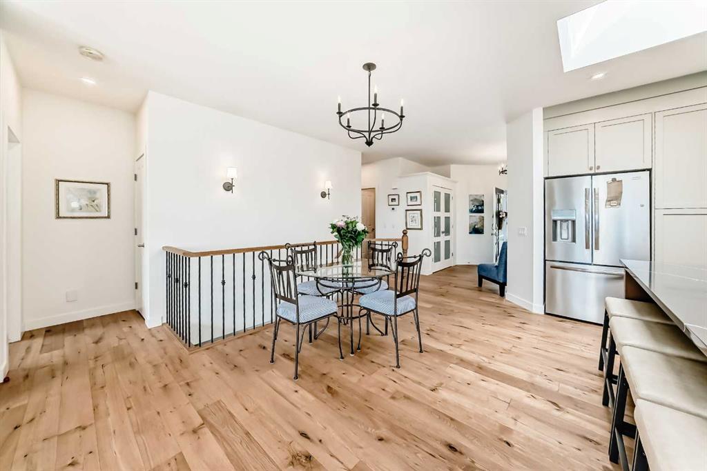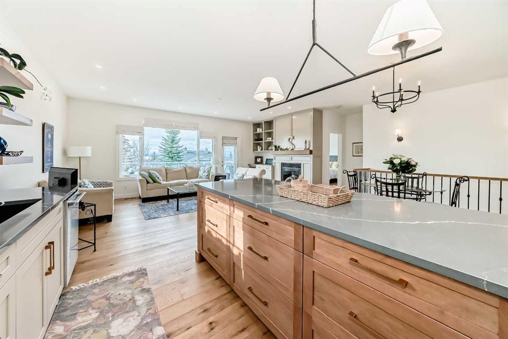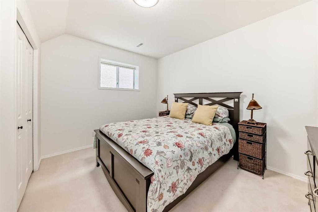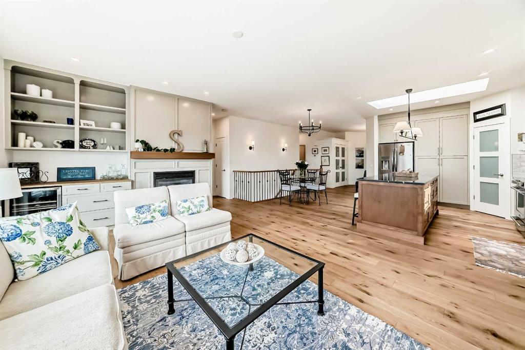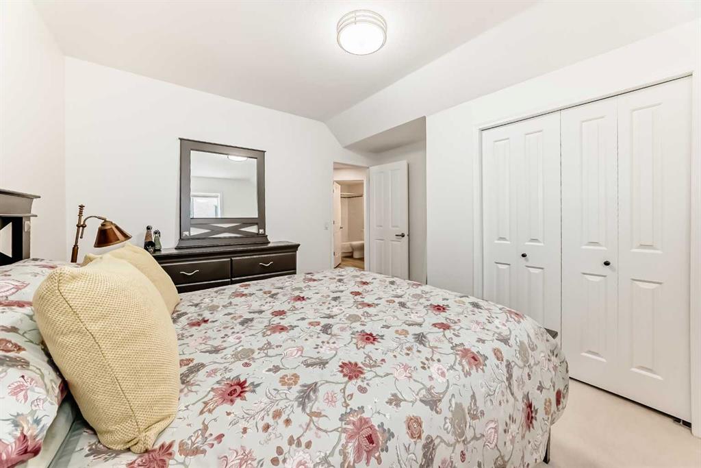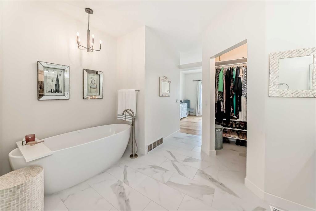 The main living area is warm and inviting with hardwood flooring and a cozy gas fireplace, creating the ideal space for both relaxing and entertaining. The primary bedroom is a true retreat, complete with a walk in closet and a luxurious 5 piece ensuite. The fully finished basement offers exceptional additional living space with in floor heating and a second fireplace. Completing the space is a wet bar, full 4 piece bathroom and two additional bedrooms, making it ideal for guests or extended family. Outside, enjoy a spacious backyard with lush grass and a concrete deck. The heated double garage adds year round convenience and comfort. Situated in a peaceful, scenic neighbourhood known for its quiet atmosphere and proximity to golf, pathways, and easy access to Calgary and the mountains.
