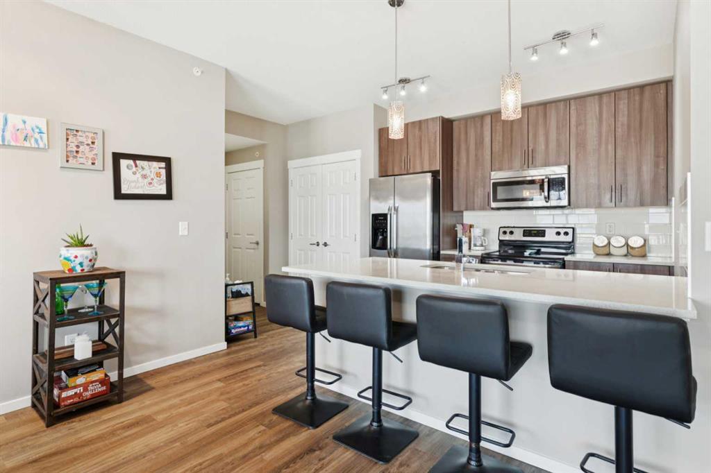 The kitchen is beautifully appointed with quartz countertops, an undermount sink, full-height subway tile backsplash, upgraded stainless steel appliances, 42” upper cabinets, pantry, and a sit-up breakfast bar. Luxury vinyl plank flooring flows throughout the main living areas, complemented by upgraded lighting and plumbing fixtures.