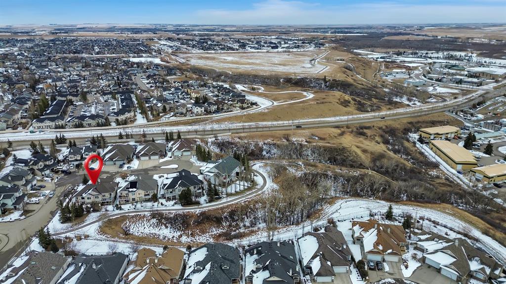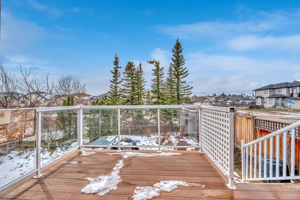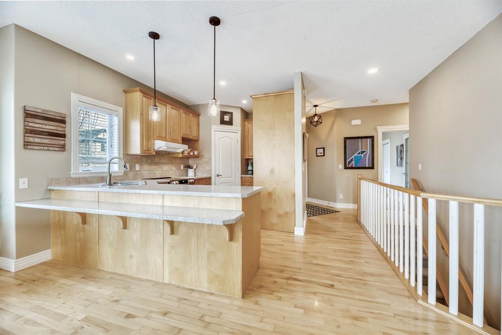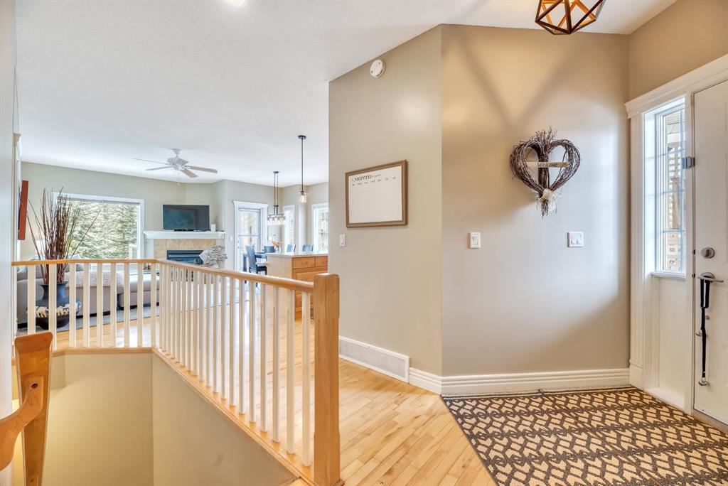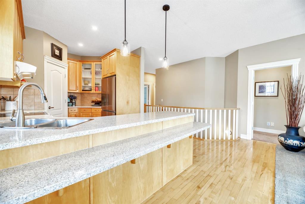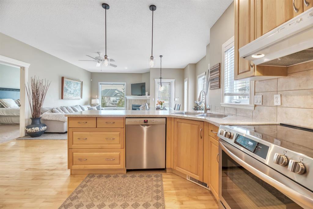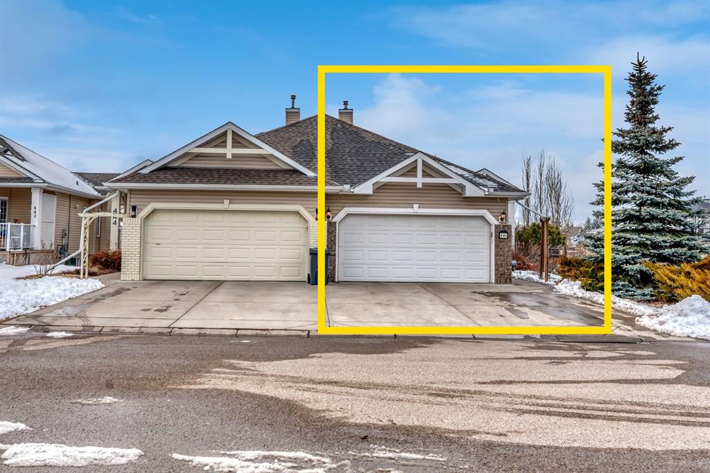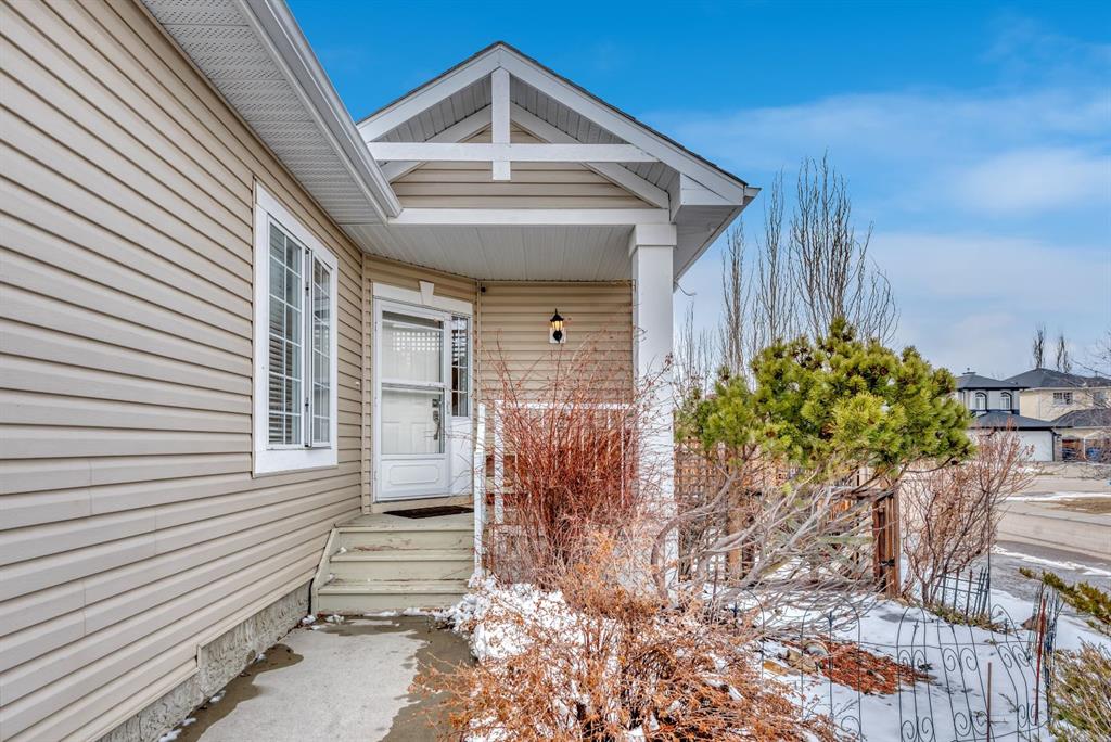 BACKING TO RAVINE & WALKING PATHS WITH LAKE ACCESS in Crystal Ridge! Welcome to this well maintained bungalow villa, ideally situated on a large corner lot in a quiet cul-de-sac and backing onto walking paths and a natural ravine. Offering both privacy and lifestyle, this home has access to Okotok’s only lake community. There’s plenty of activities around such golf course, dog park, walking/bike paths, recreation centers and of course the distinct charm and sense of community of small town living! Take in a ball game, enjoy the cute coffee shops, arts, culture and live music or a road trip to the mountains with such ease! The main floor features an inviting open-concept layout with maple hardwood flooring, a bright and functional kitchen with ample cabinetry and counter space, a corner pantry, glass accents, and a peninsula island with breakfast bar—perfect for casual dining or entertaining. The kitchen flows into the spacious living and dining areas, highlighted by a cozy gas fireplace and large windows that capture the serene views. Step out onto the west-facing deck to enjoy your private backyard and the peaceful green space beyond. The primary bedroom is generously sized and features a 4-piece ensuite along with a walk-in closet. A second main floor bedroom has flexibility as a guest room or home office. Another full bathroom with shower and convenient laundry/mud room complete the main level. The fully developed basement expands your living space with a massive family room featuring another gas fireplace, sunshine windows for lots of natural light, a third bedroom, an additional full bathroom, and plenty of storage space with loads of shelving and a wash sink. This comfortable home also offers newer appliances as well as central air for year round comfort. Outside, the west-facing backyard is beautifully landscaped with lots of trees, mature greenery and a private patio—perfect for relaxing or entertaining. An easy-care front yard and double attached garage with additional parking complete this exceptional property. Located close to schools, shopping, and all amenities, this home offers a rare combination of comfort, convenience, and lifestyle.
