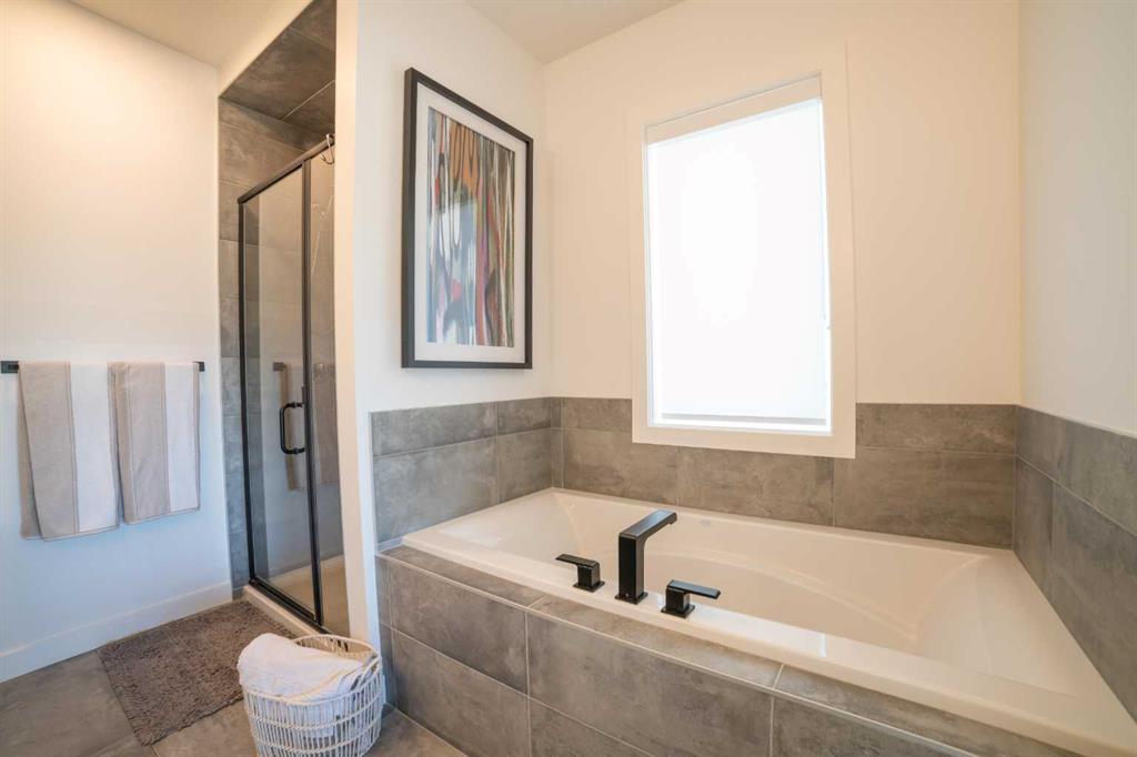 Upstairs, the 9-foot ceilings continue throughout the second floor. The large primary bedroom includes a spacious walk-in closet and an impressive ensuite featuring dual sinks, a soaking tub, and a tiled stand-up shower. Down the hallway you’ll find a conveniently located laundry room, a 4-piece bathroom, and two generously sized bedrooms, each with their own closet.