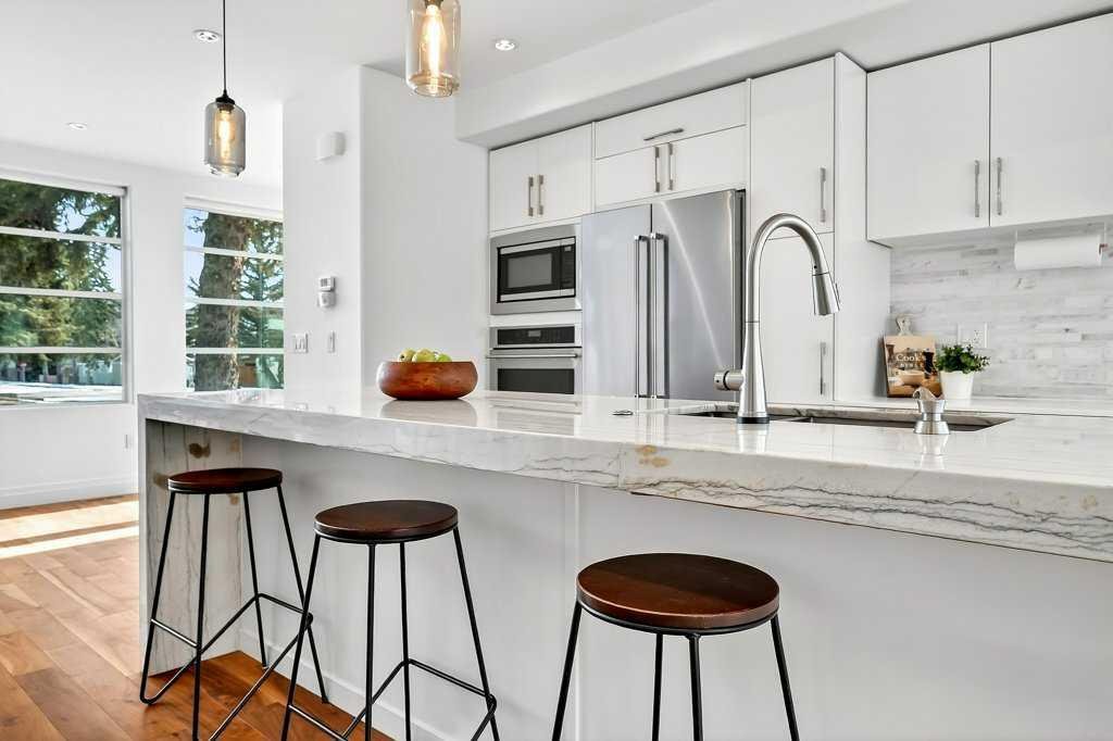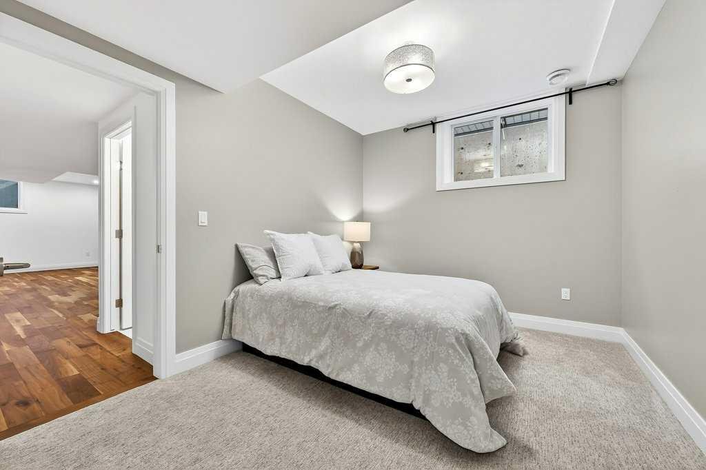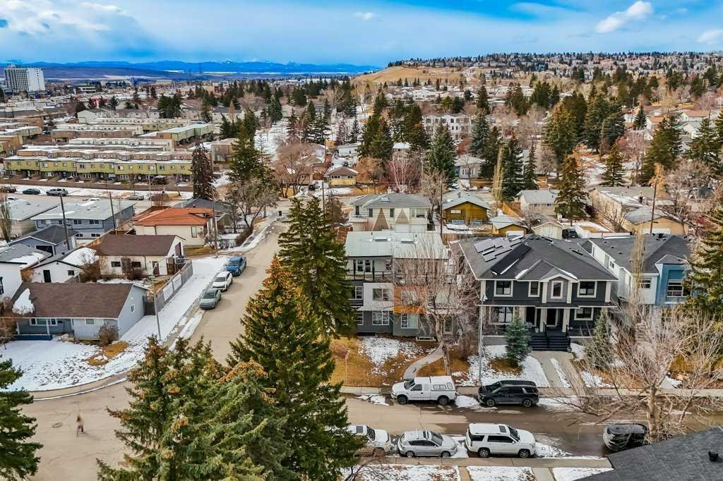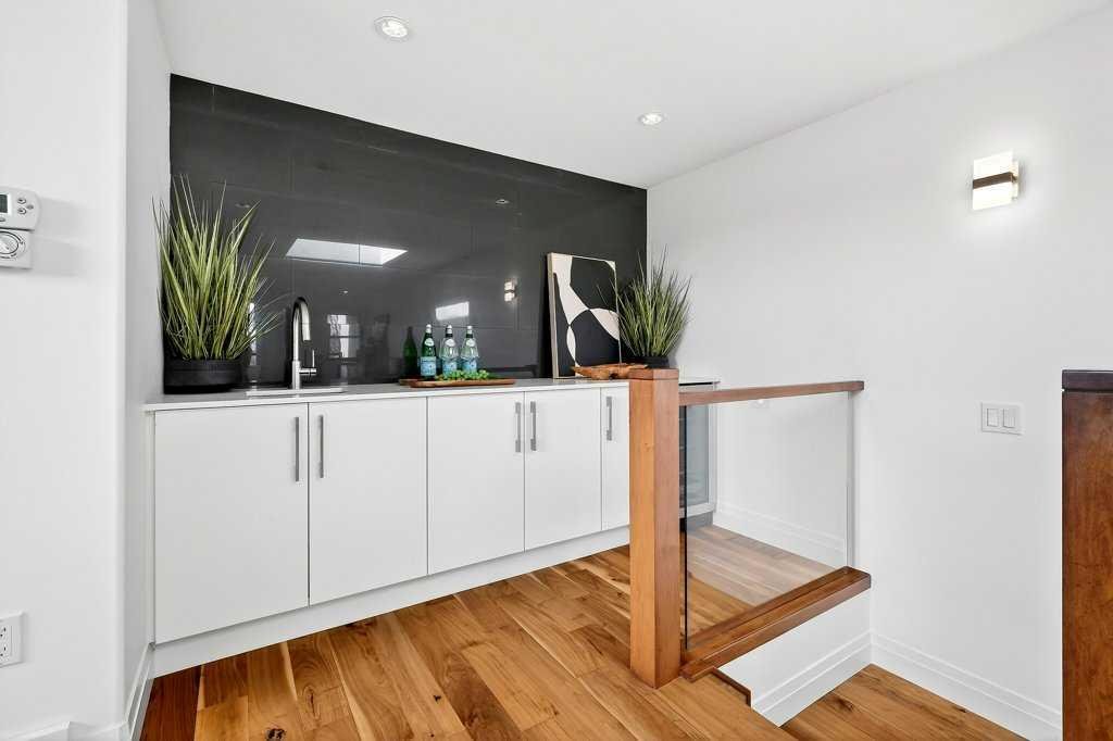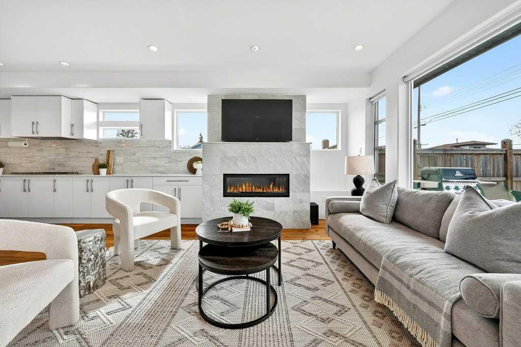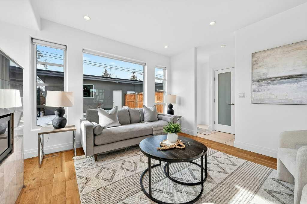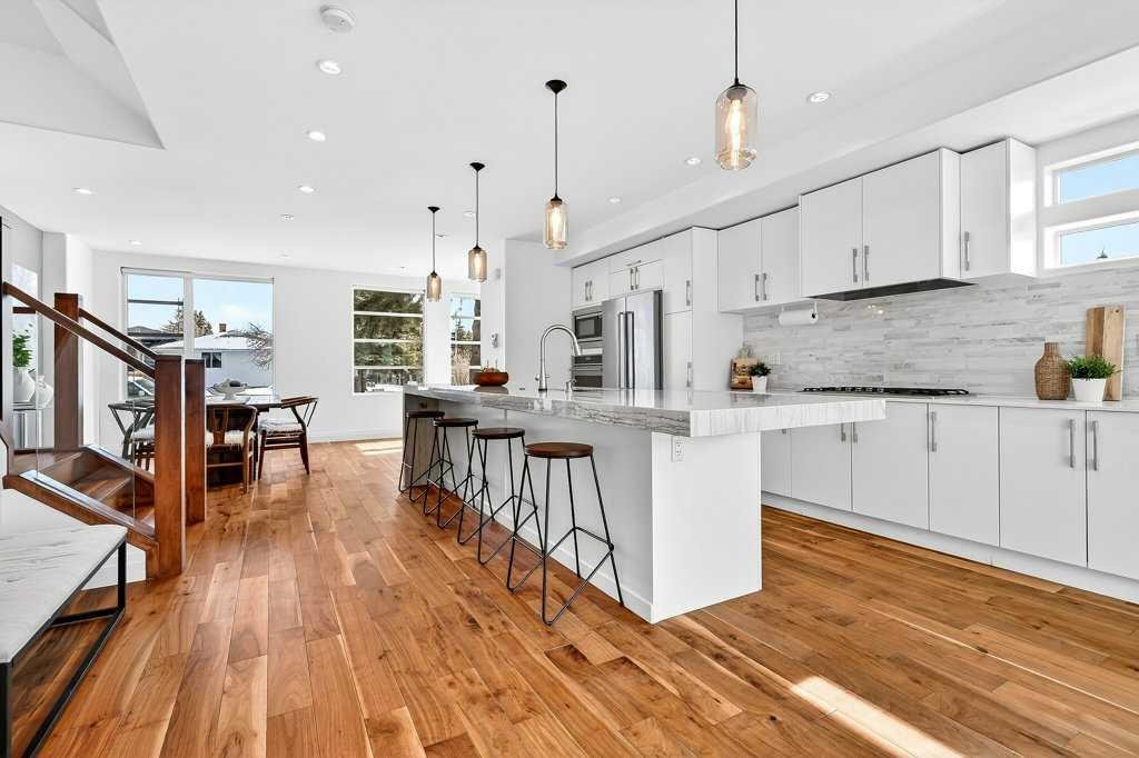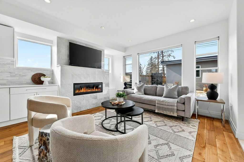 Welcome to this exceptional luxury infill in the desirable inner-city community of Glenbrook, offering over 3,000 sq ft of developed living space with 4 bedrooms and 5 bathrooms on a large corner lot with sunny south and west backyard exposure that fills the home with natural light throughout the day. The open-concept main floor is designed for both everyday living and entertaining. The stunning chef’s kitchen features high-end stainless steel appliances including a gas cooktop, extensive contemporary cabinetry, a marble backsplash, and a massive quartz island with waterfall edge and double-thick edge detail. The bright living room overlooks the backyard and is anchored by a sleek linear fireplace, creating a warm and inviting space. Walnut hardwood flooring runs throughout nearly the entire home, including the upper levels and basement living areas. The second floor offers three bedrooms, a full bathroom, convenient laundry, and mountain views. The spacious primary suite features a walk-in closet with built-ins and a spa-inspired ensuite with heated floors, double vanity, glass shower, and deep soaker tub beside a large window that fills the room with natural light. The entire third floor is a standout entertaining space, offering a bright and versatile lounge area complete with a wet bar, beverage fridge, and 2-piece bathroom. Step outside to the private balcony with gas hookup, perfect for relaxing or entertaining. The professionally developed basement includes a large recreation area with built-in wet bar, a fourth bedroom, and a full bathroom, along with in-floor slab heating for year-round comfort. Additional highlights include a double detached garage with 220V outlet for EV charging. Ideally located close to parks, schools, restaurants, and shopping at Westhills and Signal Hill Centre, with quick access to Richmond Road and Sarcee Trail and approximately an 8-minute commute to downtown Calgary.