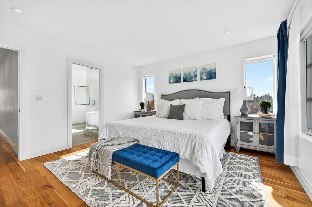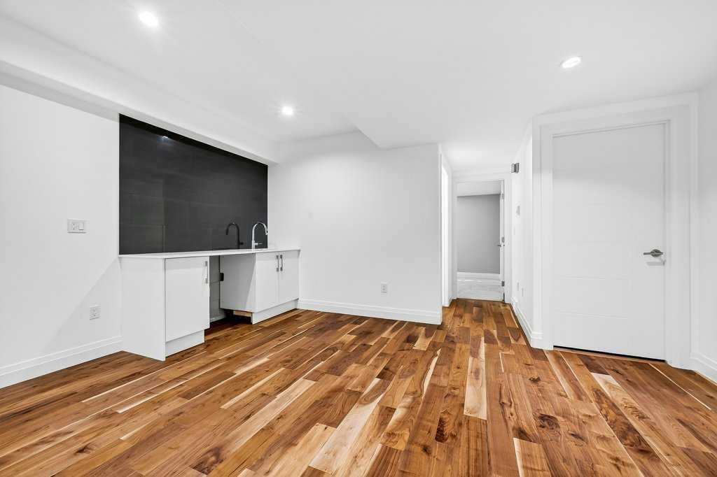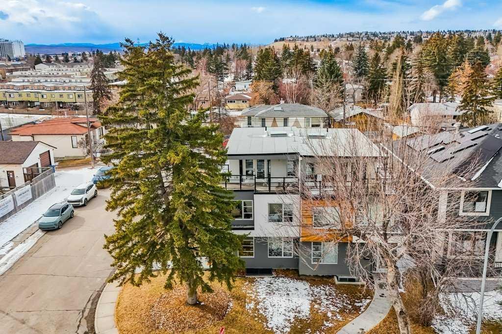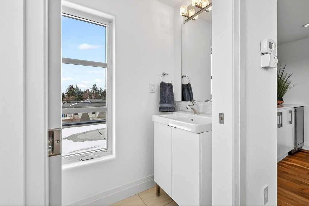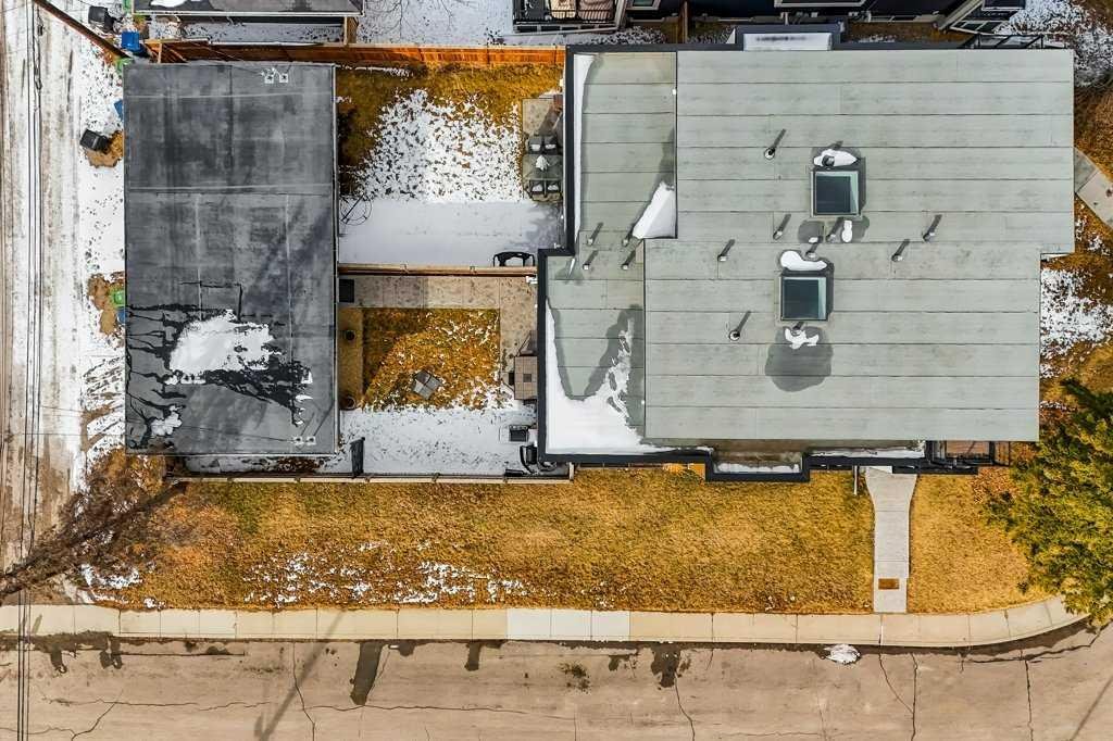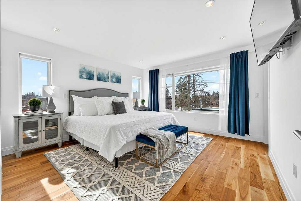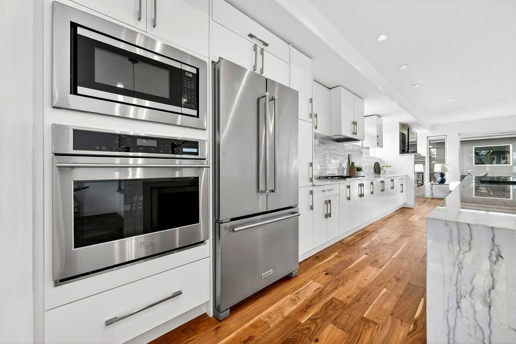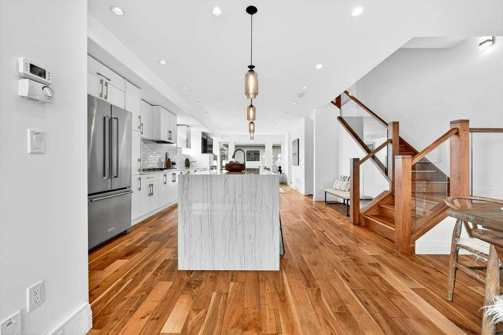 Welcome to this exceptional luxury infill in the desirable inner-city community of Glenbrook, offering over 3,000 sq ft of developed living space with 4 bedrooms and 5 bathrooms on a large corner lot with sunny south and west backyard exposure that fills the home with natural light throughout the day. The open-concept main floor is designed for both everyday living and entertaining. The stunning chef’s kitchen features high-end stainless steel appliances including a gas cooktop, extensive contemporary cabinetry, a marble backsplash, and a massive quartz island with waterfall edge and double-thick edge detail. The bright living room overlooks the backyard and is anchored by a sleek linear fireplace, creating a warm and inviting space. Walnut hardwood flooring runs throughout nearly the entire home, including the upper levels and basement living areas. The second floor offers three bedrooms, a full bathroom, convenient laundry, and mountain views. The spacious primary suite features a walk-in closet with built-ins and a spa-inspired ensuite with heated floors, double vanity, glass shower, and deep soaker tub beside a large window that fills the room with natural light. The entire third floor is a standout entertaining space, offering a bright and versatile lounge area complete with a wet bar, beverage fridge, and 2-piece bathroom. Step outside to the private balcony with gas hookup, perfect for relaxing or entertaining. The professionally developed basement includes a large recreation area with built-in wet bar, a fourth bedroom, and a full bathroom, along with in-floor slab heating for year-round comfort. Additional highlights include a double detached garage with 220V outlet for EV charging. Ideally located close to parks, schools, restaurants, and shopping at Westhills and Signal Hill Centre, with quick access to Richmond Road and Sarcee Trail and approximately an 8-minute commute to downtown Calgary.
