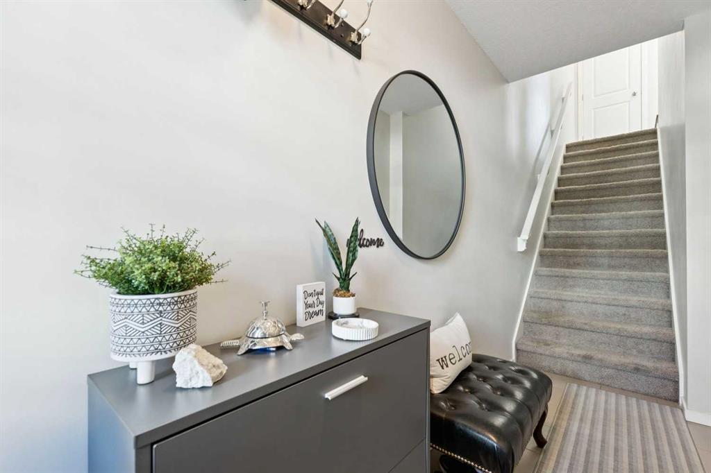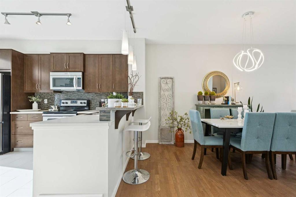 Natural light pours through this beautifully maintained townhome, where the main living level is bright, open, and exceptionally well appointed. The living room is anchored by a gas fireplace with built-ins, creating a warm and polished focal point. From there, the layout flows naturally into the dining area and kitchen, where richly stained cabinetry, stainless steel appliances, and a breakfast bar with raised seating offer both style and functionality. Just off the kitchen, the balcony overlooks the courtyard and provides a outdoor extension of the main floor. Upstairs, both bedrooms are generously proportioned and each is complete with a walk-in closet, offering a layout that is both comfortable and well designed for a professional couple, small family or roommates. The primary suite includes its own ensuite bath with an oversized shower, while the second bedroom has direct access to the stylish upstairs bath. A full-size den offers flexible space for a home office, study, nursery, or small gym, while upper-level laundry adds everyday convenience. The heated and drywalled tandem garage accommodates two vehicles and offers future development potential, while the full-length parking pad allows space for an additional vehicle, a rare advantage above many other inner units. A fenced, covered patio extends from the garage to the treed courtyard, while the rear balcony, complete with a natural gas line, overlooks the same setting and offers an easy outdoor retreat. With quick access to major routes, extensive pathway networks, nearby amenities, and the airport, this is a home that balances comfort, convenience, and thoughtful design exceptionally well.