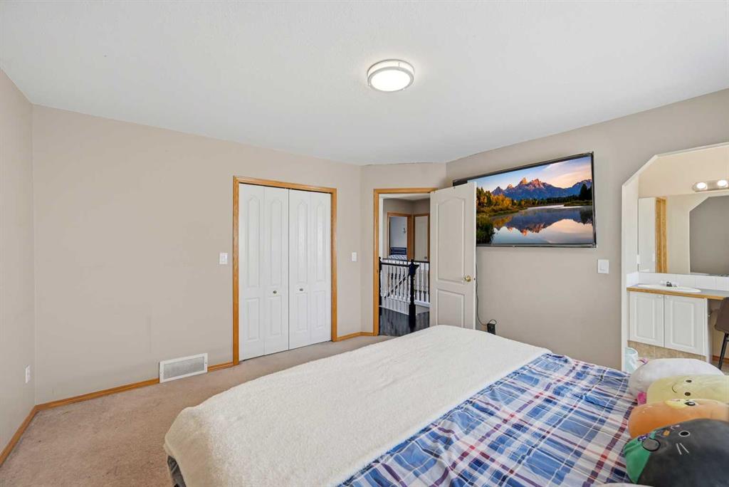 Upstairs, the staircase is finished with classic wooden spindle railings, leading to four generously sized bedrooms, ideal for growing families. The primary ensuite is well-appointed with a five-piece ensuite featuring a standing shower, offering both comfort and functionality.