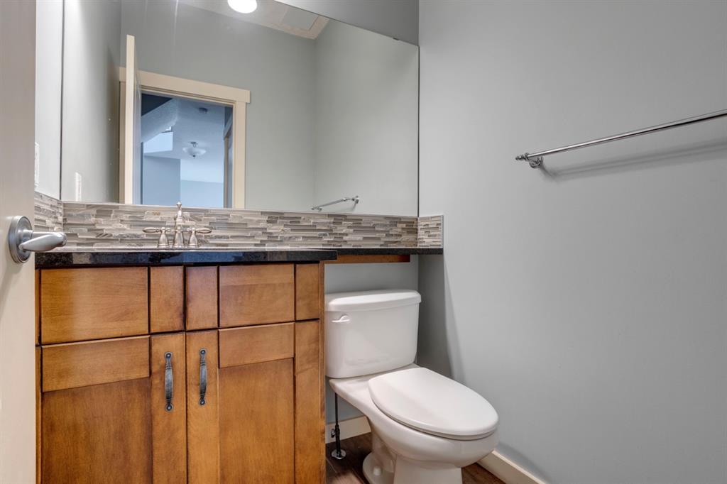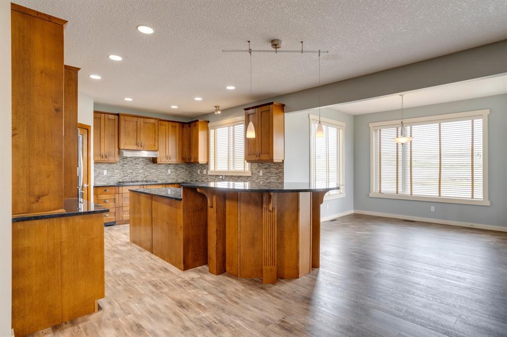 The thoughtfully designed main floor offers a large flex room—perfect for a formal dining area or a home office—along with an exceptional mudroom off the garage featuring main-floor laundry and a built-in folding table for everyday convenience. The heart of the home is the beautifully appointed kitchen, showcasing an oversized island, mosaic tile backsplash, granite countertops, full-height cabinetry, pot lighting, and stainless steel appliances including a gas cooktop, built-in wall oven, and microwave. The adjacent dining area comfortably accommodates family gatherings and entertaining, with direct access to the walkout deck—ideal for indoor-outdoor living.