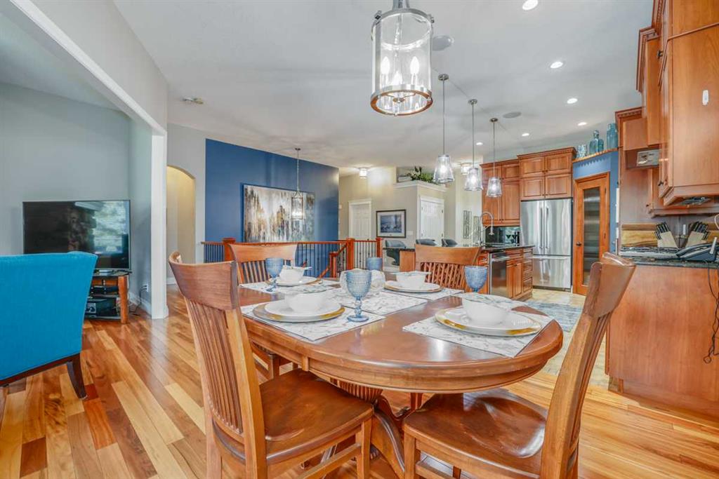 “WELCOME TO YOUR DREAM HOME” An exquisite custom walkout bungalow nestled on an exquisite, landscaped lot, on a quiet culdesac backing onto beautiful Crystal Ridge Golf Course. The home features vaulted ceilings, tigerwood hardwood floors, air conditioning, and numerous extras. The spacious open design includes a living/family room with a gorgeous stone fireplace for cozy evenings, a lovely dining area for formal times, a chef’s gourmet haven including a gas range, a built-in oven & warmer, loads of cupboards, granite counters, walk in pantry, and a fantastic huge island for entertaining. The primary bedroom features a walk in closet and five piece ensuite complete with a therapeutic air bath tub. Eating area has access to the wrap around deck to enjoy the beautiful privacy and the evening sun. For convenience, laundry and a powder room on main floor. Lower walkout level features a family/games/theatre room for enjoyable fun times. There are an additional two bedrooms, an office/den, and three piece bathroom, as well as space for a gym. The patio area features a beautiful hot tub, and steps away, a cozy firepit. The numerous extras include underground sprinkler system, Allure outside lighting, water lines in garage and on deck, air conditioning, all closets with auto lights, surround system upstairs in living & dining room, kitchen, ensuite and upper & lower deck, movie system downstairs with sub-woofer, and natural gas outlets on both upper & lower decks. Recent upgrades include roof shingles (2017), fridge with water & ice (2023), dishwasher (2024), microwave (2024), vacu flo (2023), new in slab heating pump (2024), 75 gallon hot water tank (2024), new blinds (2023). This home is located in a quiet long culdesac with a west facing back yard in beautiful Okotoks. The annual HOA gives access to Crystal Shores lake just blocks away. Don’t miss viewing this lovely home, its PRECIOUS! No sign on property.