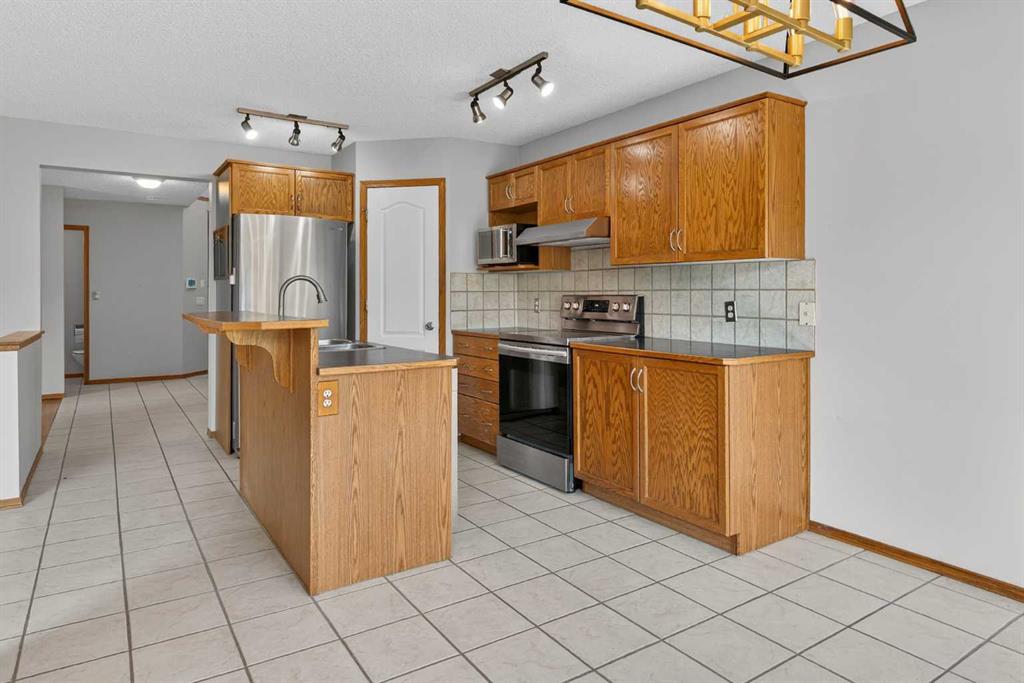 This beautiful home starts with a vaulted foyer & closet, 2-piece bath, and laundry/mud area from the garage – convenience and efficiency at each entry. The hall passes a central Den/Flex, and goes into the unique sunken-living room with full-height fireplace wall, L-shaped kitchen/corner pantry with stainless appliances, and a spacious dining room, naturally lit by huge windows and modern lighting, and clean tile/laminate floors. Exit to the incredible deck, complete with built-in bench and privacy screening, for all-season enjoyment of the sun and Chinook weather.