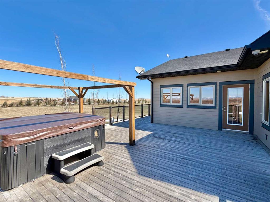 Opportunity awaits in this rare gated 5 acre fully developed acreage. This home was custom built in 2015 and includes 4 bedrooms, a fully treed yard, and a beautiful Alberta mountain view! A wrap around deck includes glass railings, a BBQ area, and your own oasis in an included hot tub! Inside you will find a natural gas fireplace, large vaulted ceilings, and an open concept kitchen and dining area perfect for entertaining. The primary suite is on the main floor, with a large walk in closet and an sprawling ensuite, with his an hers sinks, and a grand tiled shower. The home is constructed with an ICF foundation , complete with in-floor radiant heat, central air conditioning, and a security system capable of home automation. The basement boast separate areas for entertaining including a sitting area, a space for a pool table, as well as space for a home office or gaming area! Two large bedrooms have ample closet space with big bright east facing windows for that morning sunlight. Lastly, there is an oversized tub and shower in the executive basement bathroom. Other features of this home include stainless appliances, air conditioning, BBQ hookups and an OVERSIZED 30×30 heated garage! This property wont last long, so call today to book your appointment!