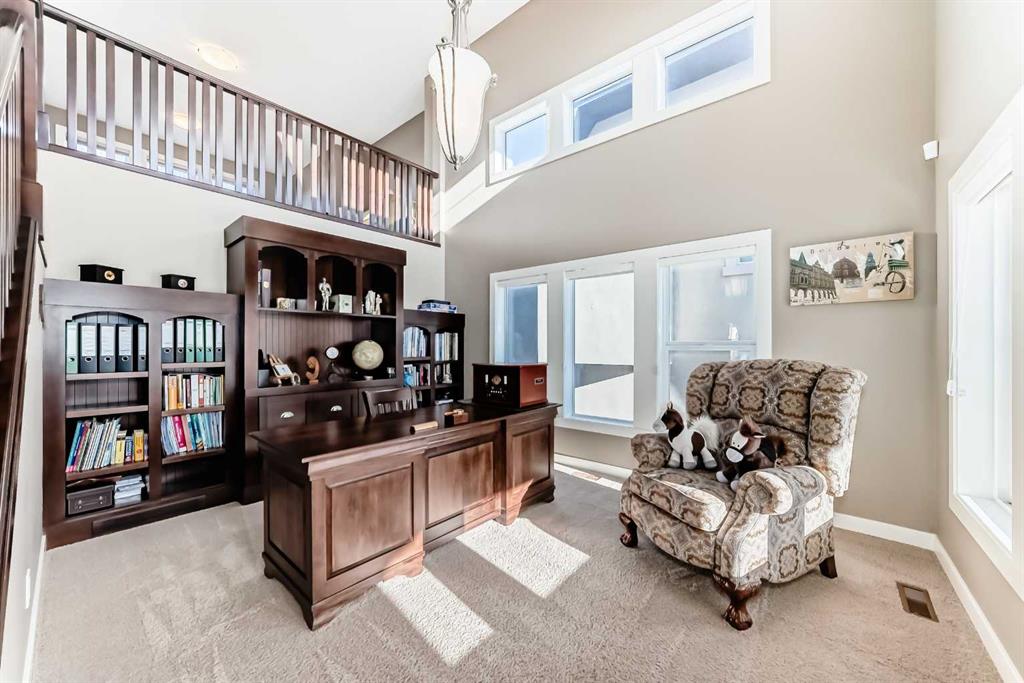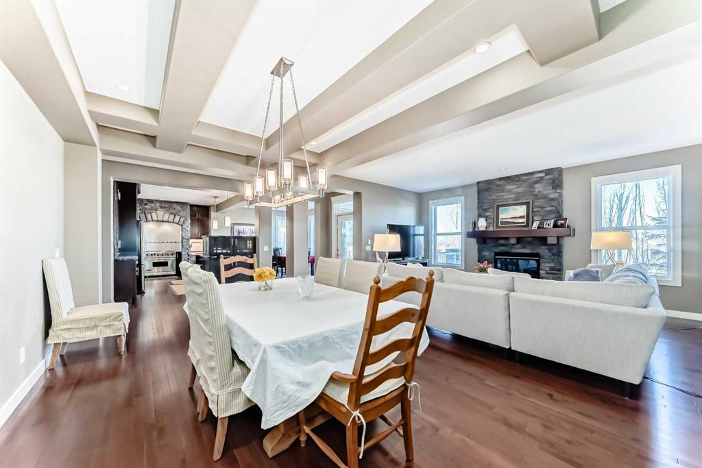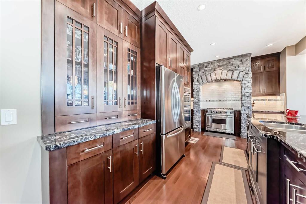 The gourmet kitchen features abundant counter and cabinet space, a large island, wine fridge, walk-in pantry, and a butler’s pantry or coffee station with prep sink—perfect for both daily living and entertaining. The dining and living areas are anchored by a striking stone-faced gas fireplace, creating a warm and inviting atmosphere. A main-floor study with custom built-ins adds versatility and function.