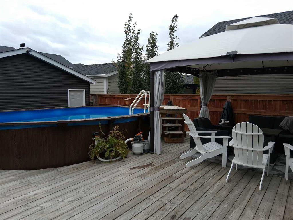Extremely well-maintained and beautifully updated home on a quiet street, just steps to parks, walking paths, schools, and a skating rink. This 3+1 bedroom, 3.5 bathroom home offers over 2,000 sq ft of finished living space. The insulated, heated garage includes 220 V power and an automatic door opener. Enjoy your massive deck and fully fenced backyard oasis featuring a gazebo and above-ground pool. The covered front porch is perfect for morning coffee. The primary suite features a walk-in closet and relaxing soaker tub. The kitchen offers granite countertops, an island, pantry, garburator, and reverse-osmosis water filter. Bright open-concept living area with ceiling fans in all rooms. No front neighbors and plenty of street parking. Located in a family-friendly community with easy access to recreation, restaurants, and a short drive to the mountains.
