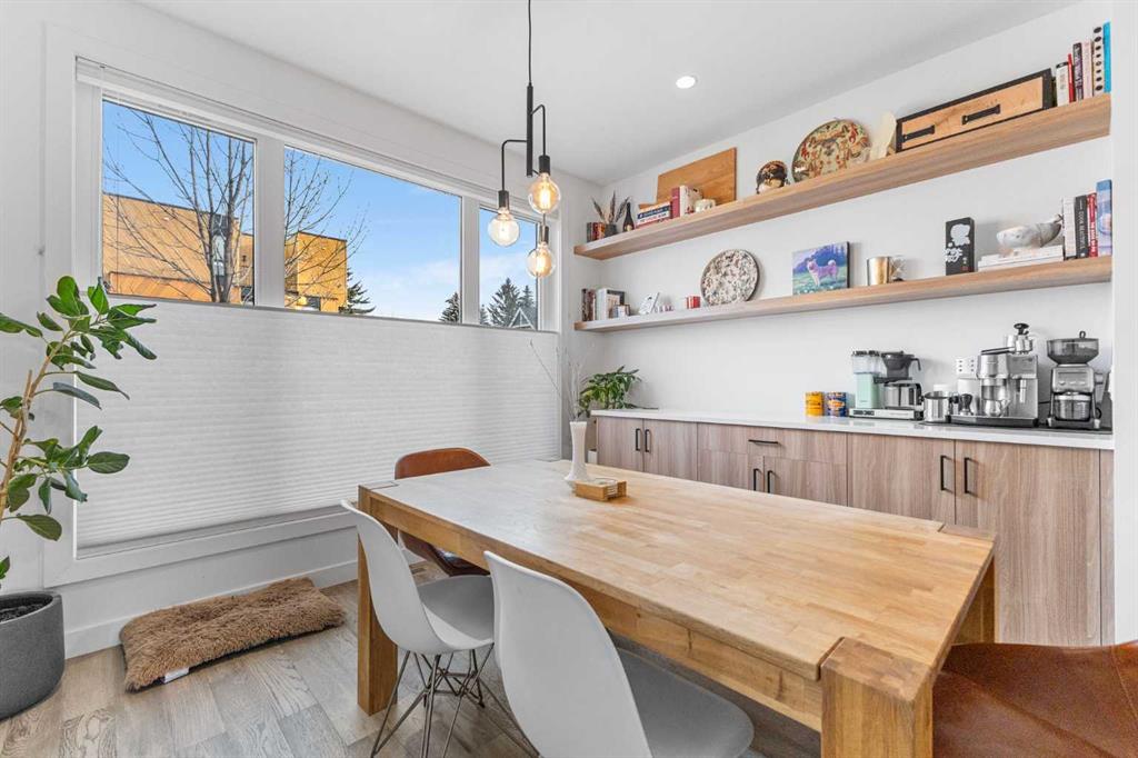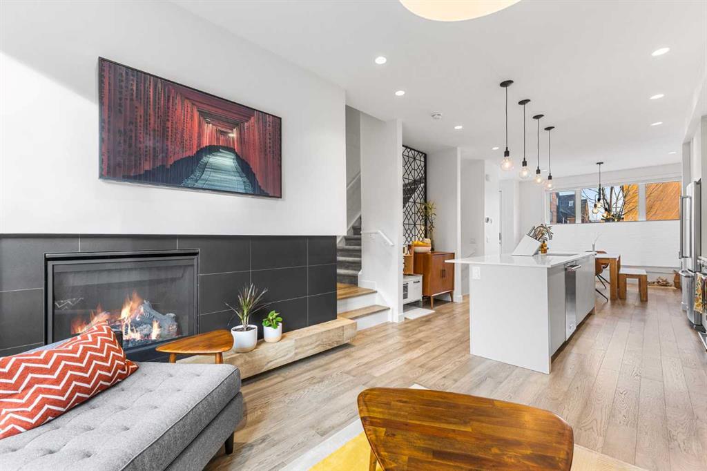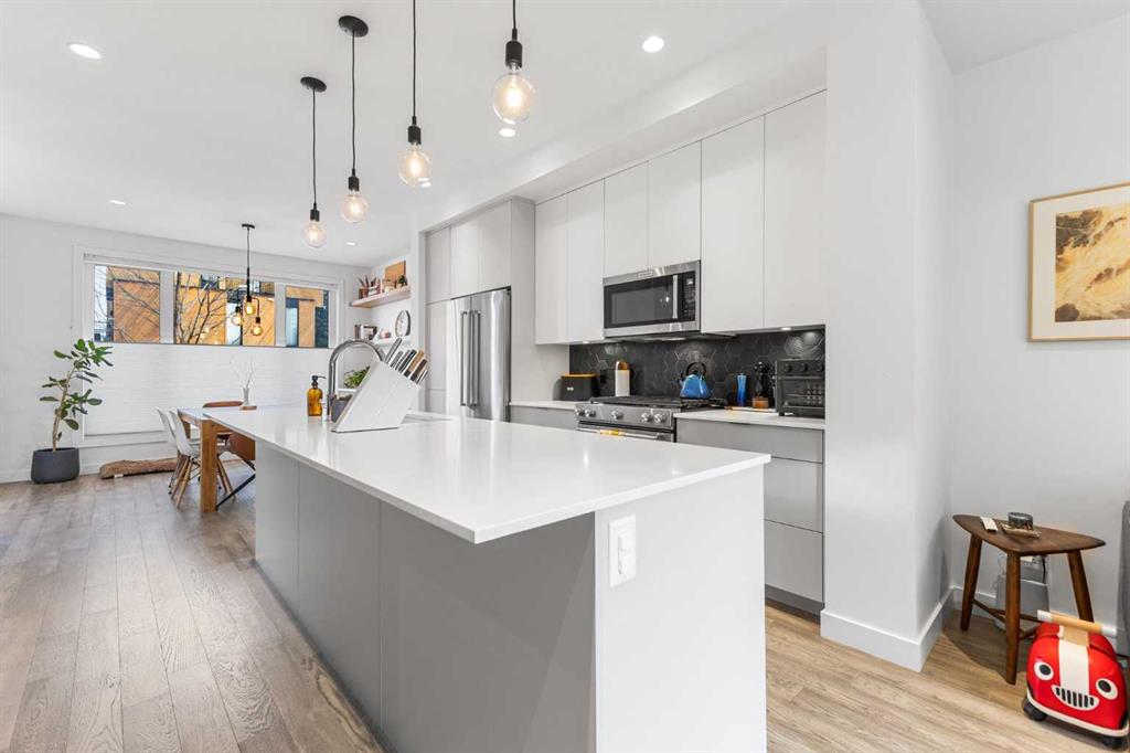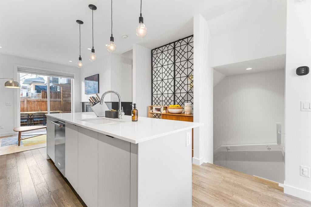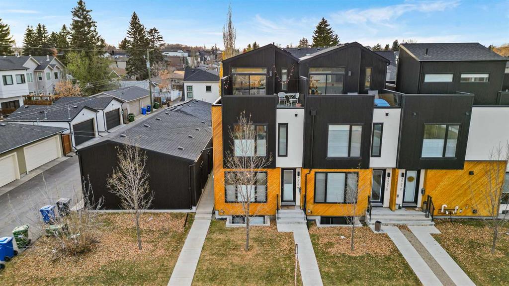 Welcome to this stunning three storey townhome in the heart of Altadore, offering over 2200 sq ft of beautifully designed living space with thoughtful upgrades and custom finishes throughout. Built in 2018, this residence combines modern style with functional design, creating a home that is as practical as it is elegant. The main floor showcases an open concept anchored by a chef’s kitchen with quartz countertops, a large island/eating bar, plenty of storage space and stainless steel appliances. Custom built cabinets with quartz counter tops and two floating wall to wall shelves add both storage and style to the adjoining dining area, while the living room with gas fireplace completes the perfect setting for entertaining. Upstairs, you’ll find two spacious bedrooms, including a primary retreat with a walk in closet and spa inspired ensuite featuring a fully tiled shower. A second full bathroom, also fully tiled, serves the additional bedroom. The upper level laundry station is a true standout: custom cabinetry with quartz countertop, two pull out hampers, floating wall to wall shelves, and a convenient hanging bar are thoughtfully positioned directly across from the stacked washer and dryer. The third floor loft is a versatile bonus space, complete with a wet bar and hardwood flooring, ideal for a media room, home office, or lounge. From here, step out and enjoy the views from the private rooftop patio. The fully finished basement offers a spacious recreation room, third bedroom, and a full bathroom with the comfort of heated floors. Outside, enjoy the back deck, enhanced with custom built furnishings that elevate everyday living. Cleverly designed planters, finished in stained wood, and at varying heights provide the perfect backdrop for creeping vines, clematis, or even an herb garden, while a custom prep station with natural stone top, storage, and privacy wall makes summer barbecues effortless. Other notable features include central air conditioning for year-round comfort and the convenience of private direct access to a single detached garage just steps away from back door. Located in one of Calgary’s most desirable inner city communities, this home is steps from parks, schools, shopping, and vibrant Marda Loop amenities, with quick access to downtown. This Altadore townhome is the perfect blend of modern design, custom craftsmanship, and urban convenience—ready to welcome its next owner.
