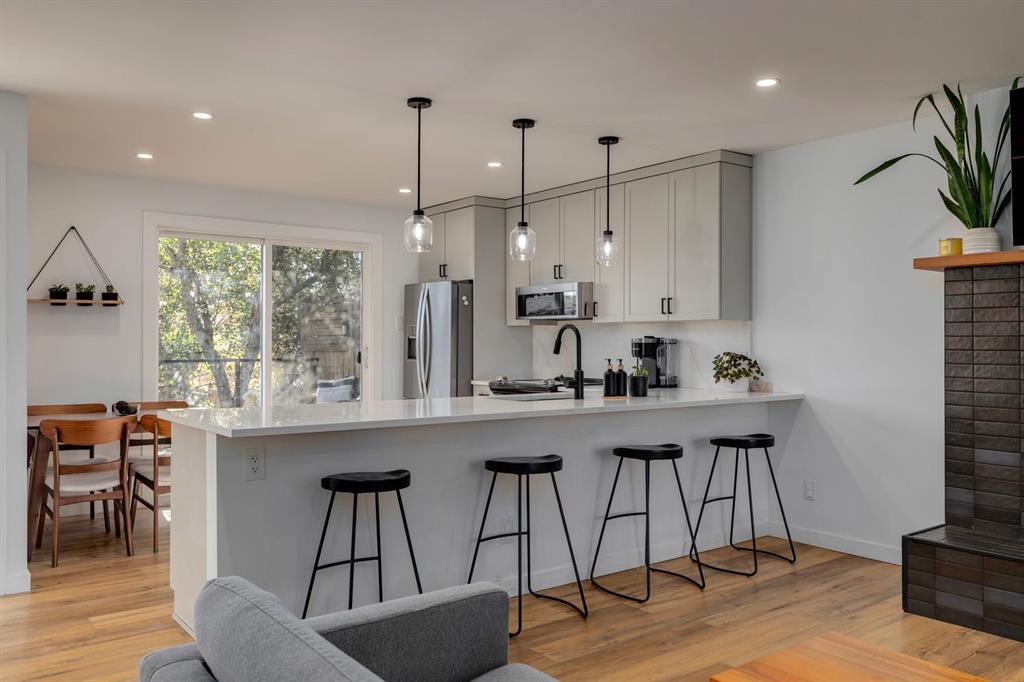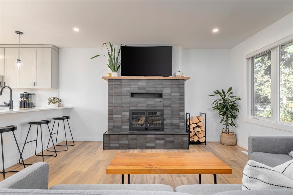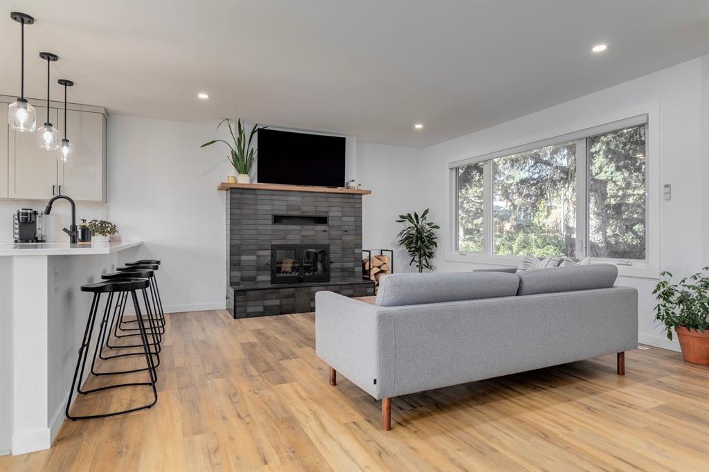Step inside to a spacious living room featuring a stunning black-tiled, real wood-burning fireplace with a brand-new insert, perfect for cozy winter nights. New custom remote controlled blinds throughout the main floor and privacy film on front window. The open-concept layout connects the living, dining, and kitchen areas seamlessly, with quartz counters, stainless steel appliances, and sleek cabinetry making the kitchen a true showpiece and perfect place to entertain.