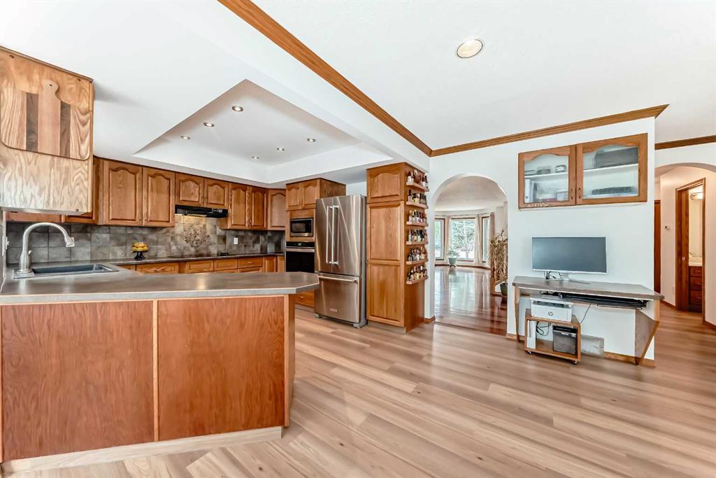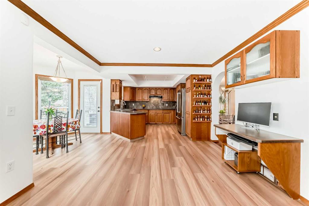 The main floor also features a warm and comfortable family room, perfect for relaxing evenings, complete with a beautiful gas fireplace, along with a built-in desk for work or study, a convenient 2-piece powder room, and a spacious laundry area.