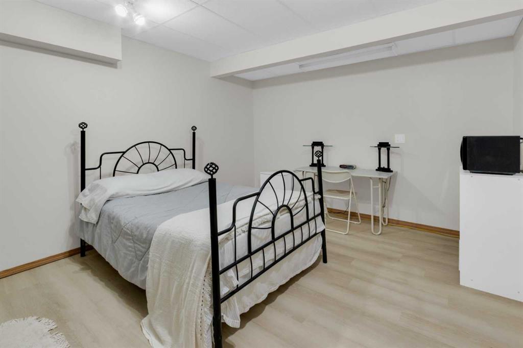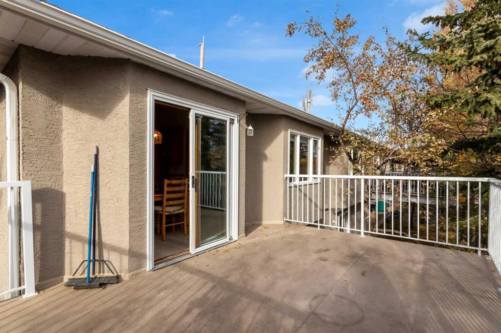 Over 2800 sq.ft. of developed living space in this exceptionally private, vaulted, walkout, villa style home in an amazing location! You will love the light airy feel of vaulted ceilings in the spacious main floor living, dining, kitchen, den/office, and bedroom areas. This surprisingly bright end unit walkout bungalow has sunlight spilling in all day from skylights plus large windows on 3 sides – south, west and east. Freshly painted in neutral designer colours throughout (Oct 2025) with vinyl plank flooring updates accenting hardwood floors in large functional living area with gas fireplace, dining and den areas. Enjoy sunrise coffees and cool evenings on the peaceful secluded and extended deck surrounded by birdsong in mature flowering trees. A big main level den or sitting room connected to a fresh white kitchen with a south facing box window which adds light to an already bright space. Generous walkout level family room with oversize windows and sliding doors to a private patio. Also features a large bedroom with adjacent full bath, plus 2 flex rooms and loads of storage. New HE furnace & HW tank, 2019. (NOTE: All the “Poly B” pipes have been replaced). Super convenient location – imagine walking literally just 1 block to Sunterra West Market Square, the L.R.T., coffee shops, pubs, and restaurants. Also close to natural ravine walking paths, dog parks & bike paths. Easy access to major commuting routes including Sarcee trail and the SW Ring Road. Click on 3D for interactive floorplans. NOTE This the end unit of a triplex. Just move in, relax, and enjoy your easy care, lock and leave lifestyle!