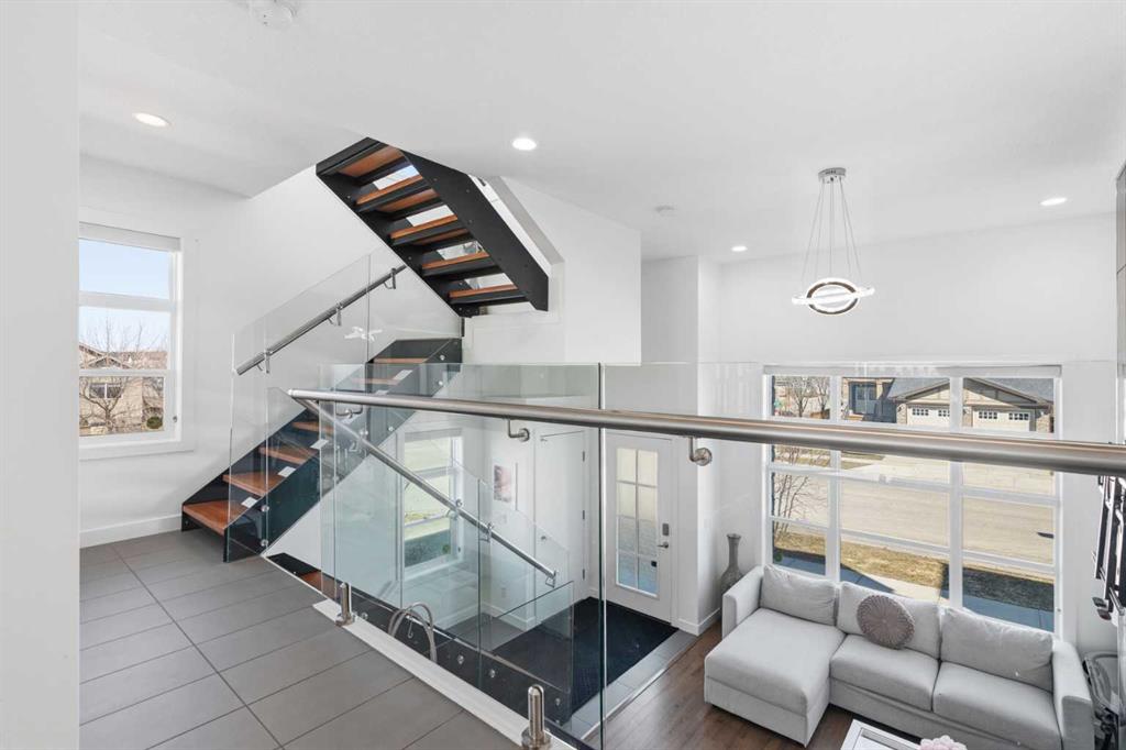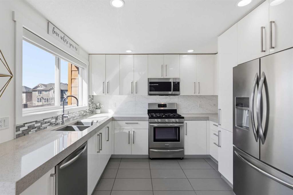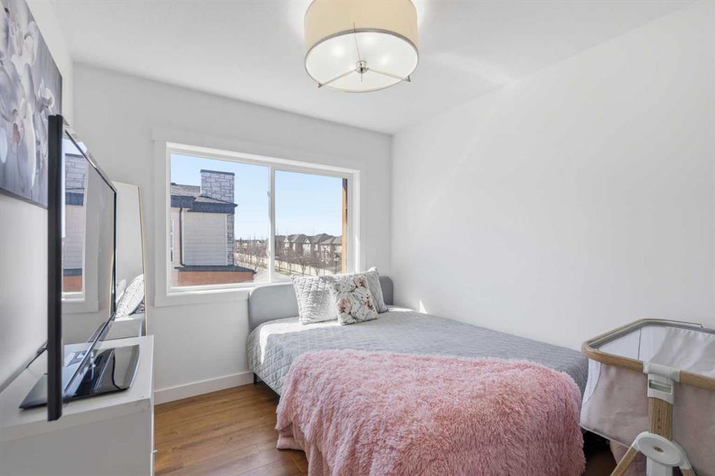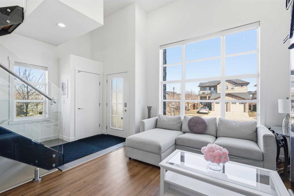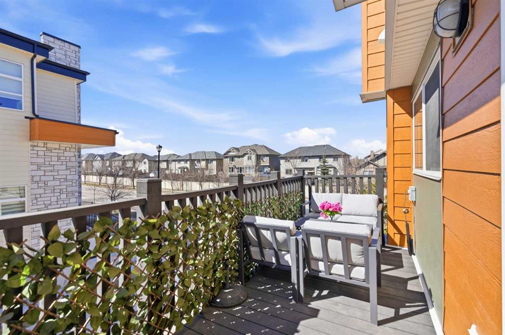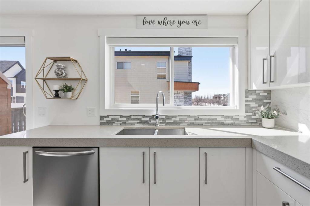 **OPEN HOUSE SAT APR 25TH, 1PM-3PM** STUNNING HIGH-END TOWNHOME | RARE END UNIT | SOUTH BALCONY EXPOSURE! Don’t miss out on this opportunity to own this gorgeous, LUXURY-LEVEL home in the highly sought-after community of Bayside! This exceptional end unit stands out with its low-maintenance exterior featuring hardy board siding & stone, and an interior that defines modern elegance with custom finishings throughout. Highlights of the upscale design include a modern CHEF’S KITCHEN with white flush cabinetry | sleek QUARTZ counters | SS appliances | and a gas range. The home is completely CARPETLESS and features a stunning modern white paint theme throughout, accented by architectural masterpieces like steel open risers and tempered glass railings. You will be wowed by the 16ft living room ceilings and the custom tile-to-ceiling fireplace, all framed by massive windows and extra side glass that flood the entire space with an excess of natural light. Walk into the bright and spacious main level where the open-concept design, perfect for entertaining. Go upstairs to the kitchen and dining areas, where you will have access to the large balcony, ideal for a BBQ and a sitting table to enjoy those summer evenings. Upstairs you will discover the impressive 3-bedroom layout, including a massive primary bedroom with a dual-sink ensuite bath, along with another full bathroom and the added convenience of upper-level laundry. The professionally finished basement offers a large flex area and another full bathroom, providing the perfect space for a home gym, office, or media room. Bayside has so much to offer with conveniences all around, including quick access to schools, local shopping, groceries, and the beautiful community canals and water features. You are only steps away from parks and extensive pathway systems, making this the perfect retreat in a serene suburban setting. House Extras Include: Newer Garage Door ($4,000 value), a NEW Microwave Hood Fan, an A/C rough-in, and Custom Window Coverings throughout. This home shows 10/10 and is a rare find in a prime location—come check it out before it’s gone!