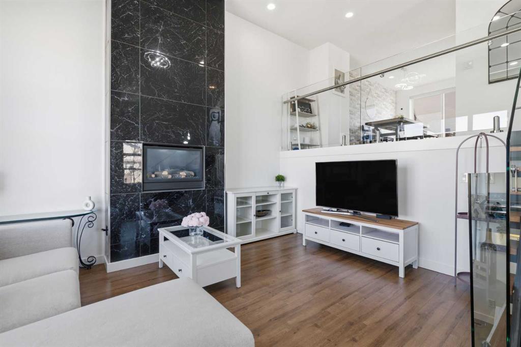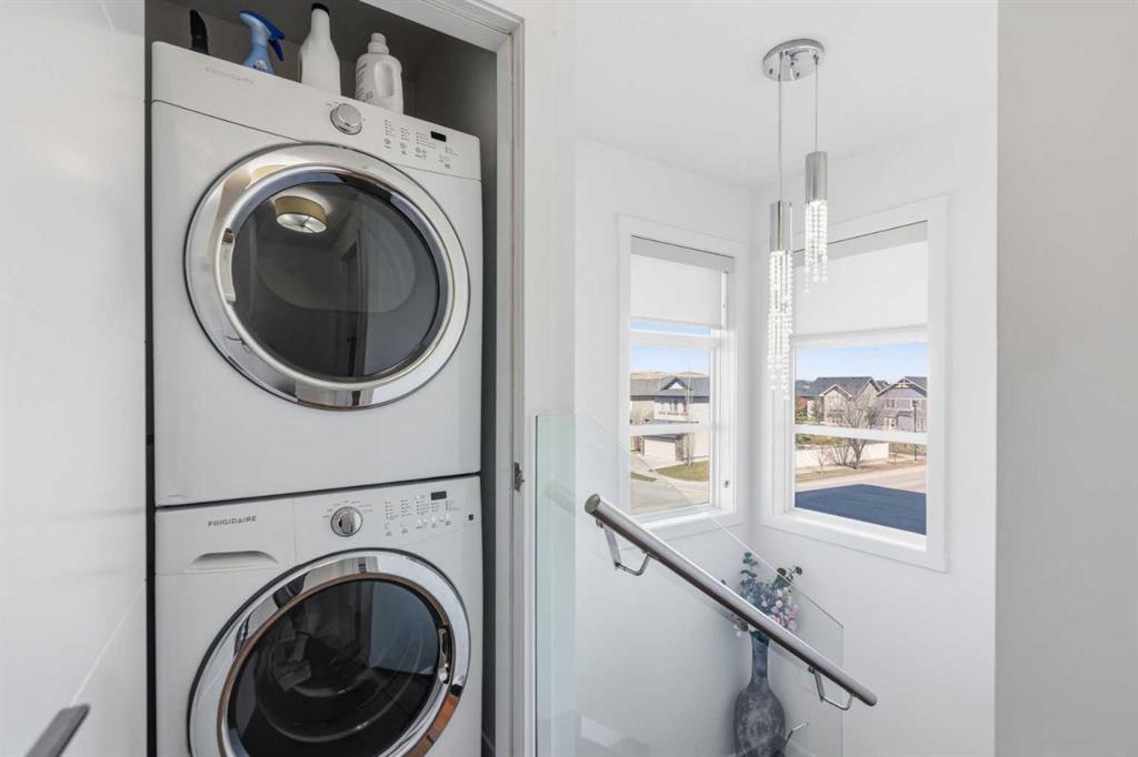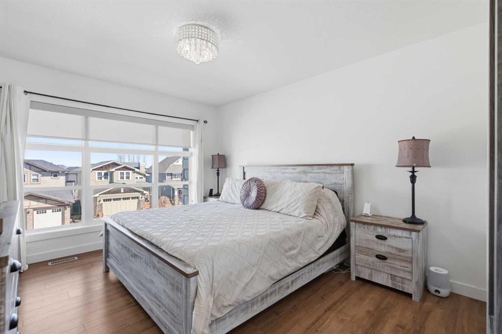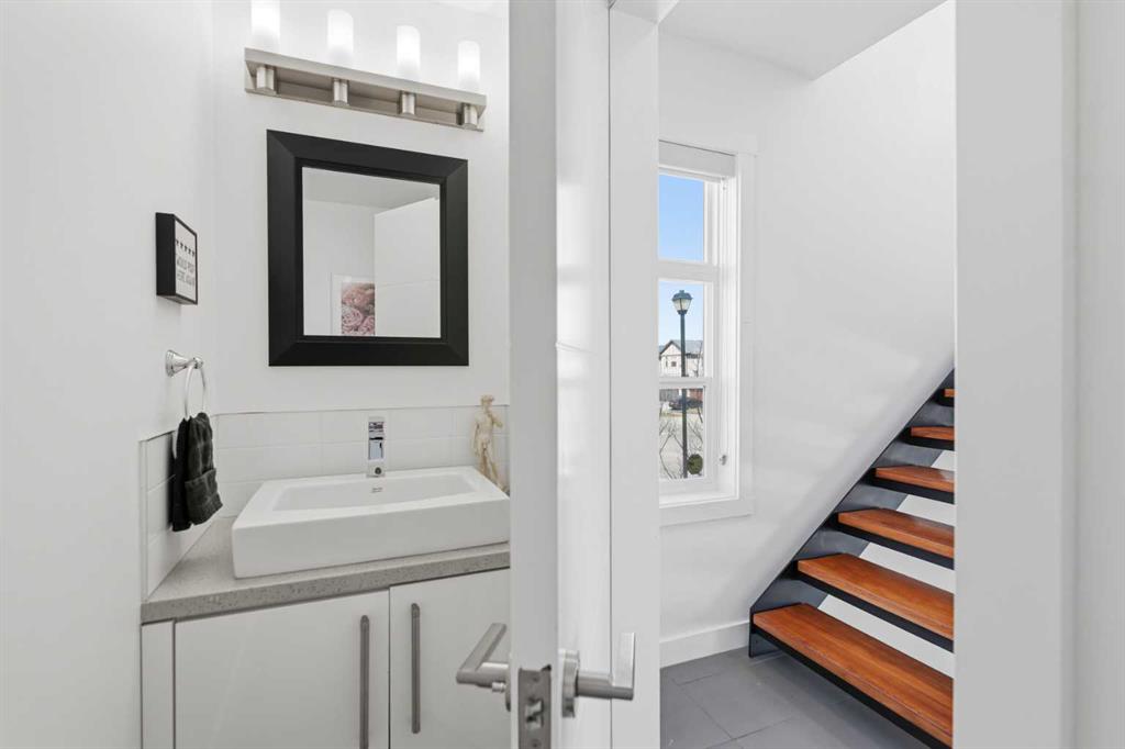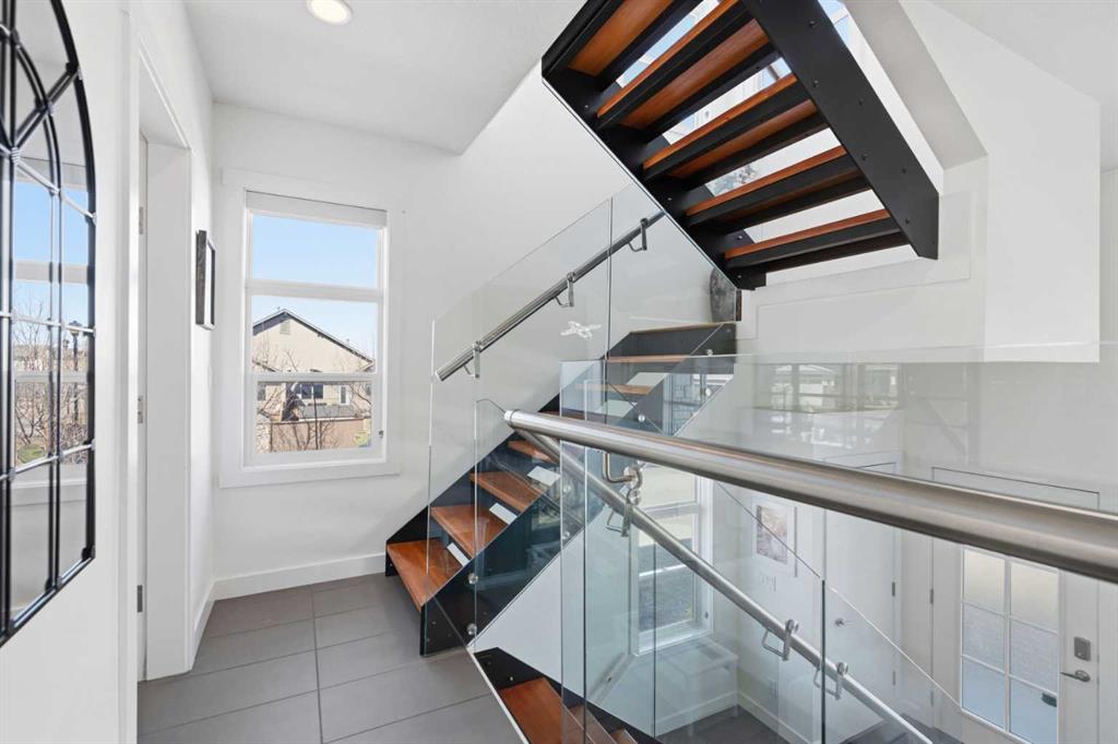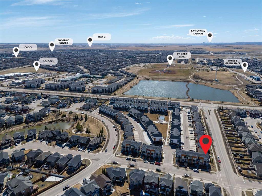 **OPEN HOUSE SAT APR 25TH, 1PM-3PM** STUNNING HIGH-END TOWNHOME | RARE END UNIT | SOUTH BALCONY EXPOSURE! Don’t miss out on this opportunity to own this gorgeous, LUXURY-LEVEL home in the highly sought-after community of Bayside! This exceptional end unit stands out with its low-maintenance exterior featuring hardy board siding & stone, and an interior that defines modern elegance with custom finishings throughout. Highlights of the upscale design include a modern CHEF’S KITCHEN with white flush cabinetry | sleek QUARTZ counters | SS appliances | and a gas range. The home is completely CARPETLESS and features a stunning modern white paint theme throughout, accented by architectural masterpieces like steel open risers and tempered glass railings. You will be wowed by the 16ft living room ceilings and the custom tile-to-ceiling fireplace, all framed by massive windows and extra side glass that flood the entire space with an excess of natural light. Walk into the bright and spacious main level where the open-concept design, perfect for entertaining. Go upstairs to the kitchen and dining areas, where you will have access to the large balcony, ideal for a BBQ and a sitting table to enjoy those summer evenings. Upstairs you will discover the impressive 3-bedroom layout, including a massive primary bedroom with a dual-sink ensuite bath, along with another full bathroom and the added convenience of upper-level laundry. The professionally finished basement offers a large flex area and another full bathroom, providing the perfect space for a home gym, office, or media room. Bayside has so much to offer with conveniences all around, including quick access to schools, local shopping, groceries, and the beautiful community canals and water features. You are only steps away from parks and extensive pathway systems, making this the perfect retreat in a serene suburban setting. House Extras Include: Newer Garage Door ($4,000 value), a NEW Microwave Hood Fan, an A/C rough-in, and Custom Window Coverings throughout. This home shows 10/10 and is a rare find in a prime location—come check it out before it’s gone!
