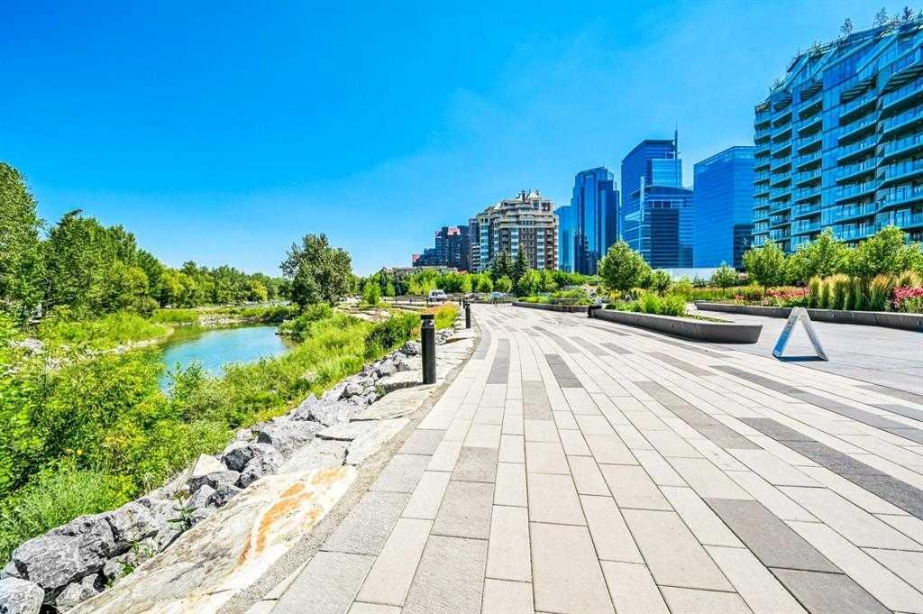 Welcome to the Point on the Bow one of Calgary’s finest and most prestigious luxury buildings. Immaculate perfection with this bright and upgraded condominium home with entertaining open floor plan and large south facing floor-to-ceiling windows providing an abundance of natural light. This meticulously well-maintained home was just freshly painted throughout and recently renovated with gorgeous hardwood flooring, 3 pce shower stall and upgraded air conditioning unit. Beautiful open kitchen with large eat-in Island, granite counter tops, stainless steel appliance package, large pantry and plenty of cupboard space. Spacious living and dining areas with gas fireplace and access to large covered balcony with nice views of the Bow River Ravine. Primary bedroom is very spacious with 2nd gas fireplace, walk-in closet, 4 pce ensuite bathroom, jetted soaker tub, shower stall and access to large balcony. Guest bedroom is a good size with corner office area, built-in shelving and double closets. 3 pce main bathroom with renovated shower stall is conveniently located next to guest bedroom. Comes with separate laundry room, washer/dryer stack, rough-in vacuum system, underground titled parking stall and secure storage locker room conveniently located in front of your parking stall close to the elevator! The location is extraordinary situated across from Peace Park on quiet cul-de-sac in West Eau Claire! The luxurious Point on the Bow has an incredible Tropical Atrium Lobby, first-class amenities, full-time concierge service and efficient onsite building manager. The Point Spa amenities include indoor pool, hot tub, fully equipped fitness room, private social lounge with full kitchen, south facing garden terrace with gas bbq, main floor library with billiard table and wet bar, underground visitor parking and fully-equipped car wash bay. The beautiful Tropical Atrium Lobby creates a lush natural garden oasis with extensive ledge stone planters and bridge, 2 impressive granite waterfalls with trickle creek ponds and comfortable seating areas. This amazing lifestyle opportunity can be yours with close proximity to the world-class pathway system, beautiful Prince’s Island Park, Bow River and Lagoon, Eau Claire Athletic Club, fine Dining and great Restaurants, Cafes and Pubs, Plus 15 Skywalk System, LRT & Transportation, Peace Bridge and just a short walk to Kensington Shops, Safeway and Calgary’s vibrant city center. Time to enjoy the ultimate in downtown urban living!